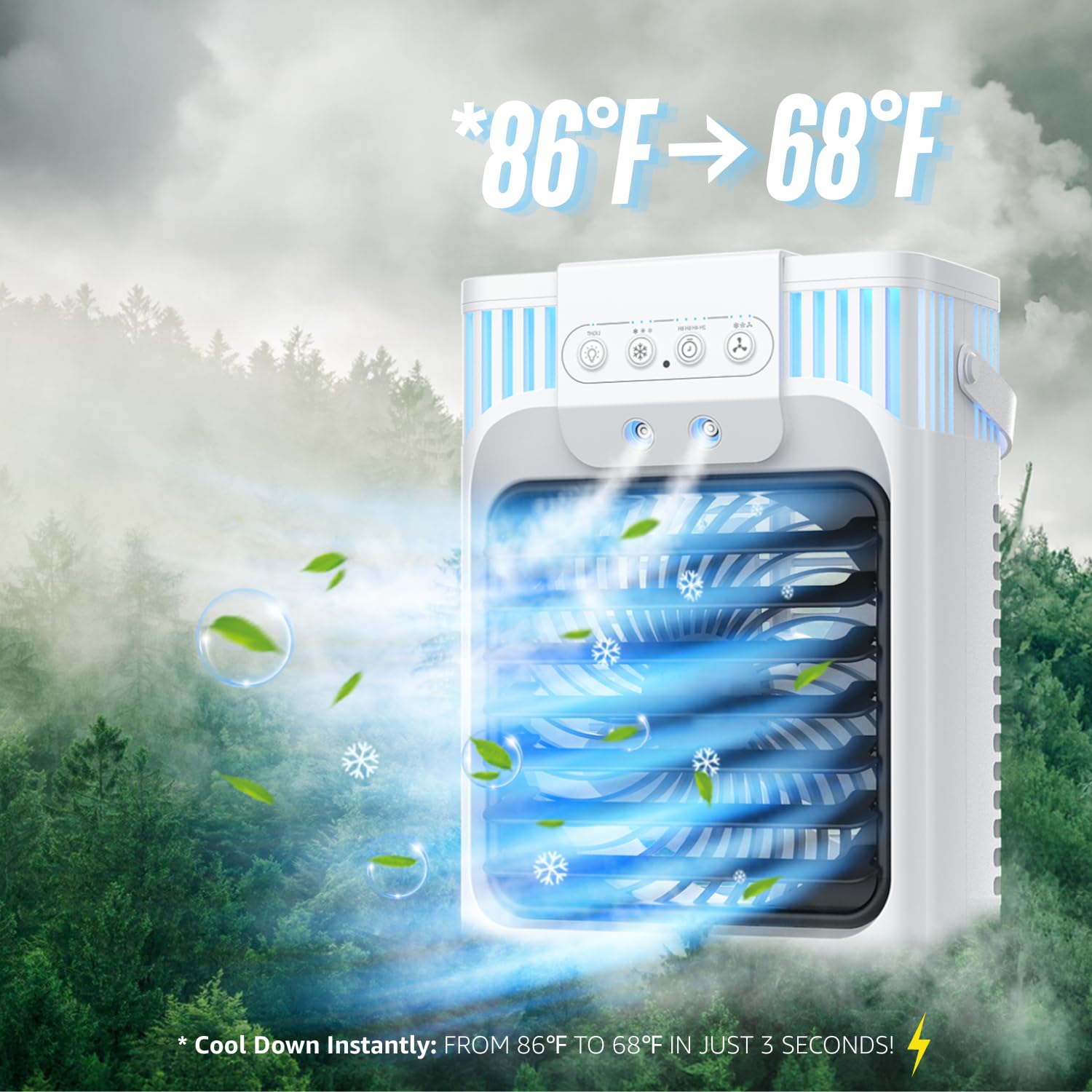 • 【GET CHILLED IN A FLASH FROM 86℉ → 68℉!】 Our portable air conditioner delivers a powerful chill! Personalize your cooling journey with 3-speed modes (Natural/Med/High) and 3 mist settings (Natural/Low Cool Mist/High Cool Mist). Boasting dual atomizers and cutting-edge triple refrigeration tech, our air conditioner portable creates a revitalizing cooling mist in the blink of an eye. Join over 300,000 satisfied customers who enjoyed refreshing coolness all summer long! This portable ac unit for bedroom will make you wonder why you didn't find it earlier!