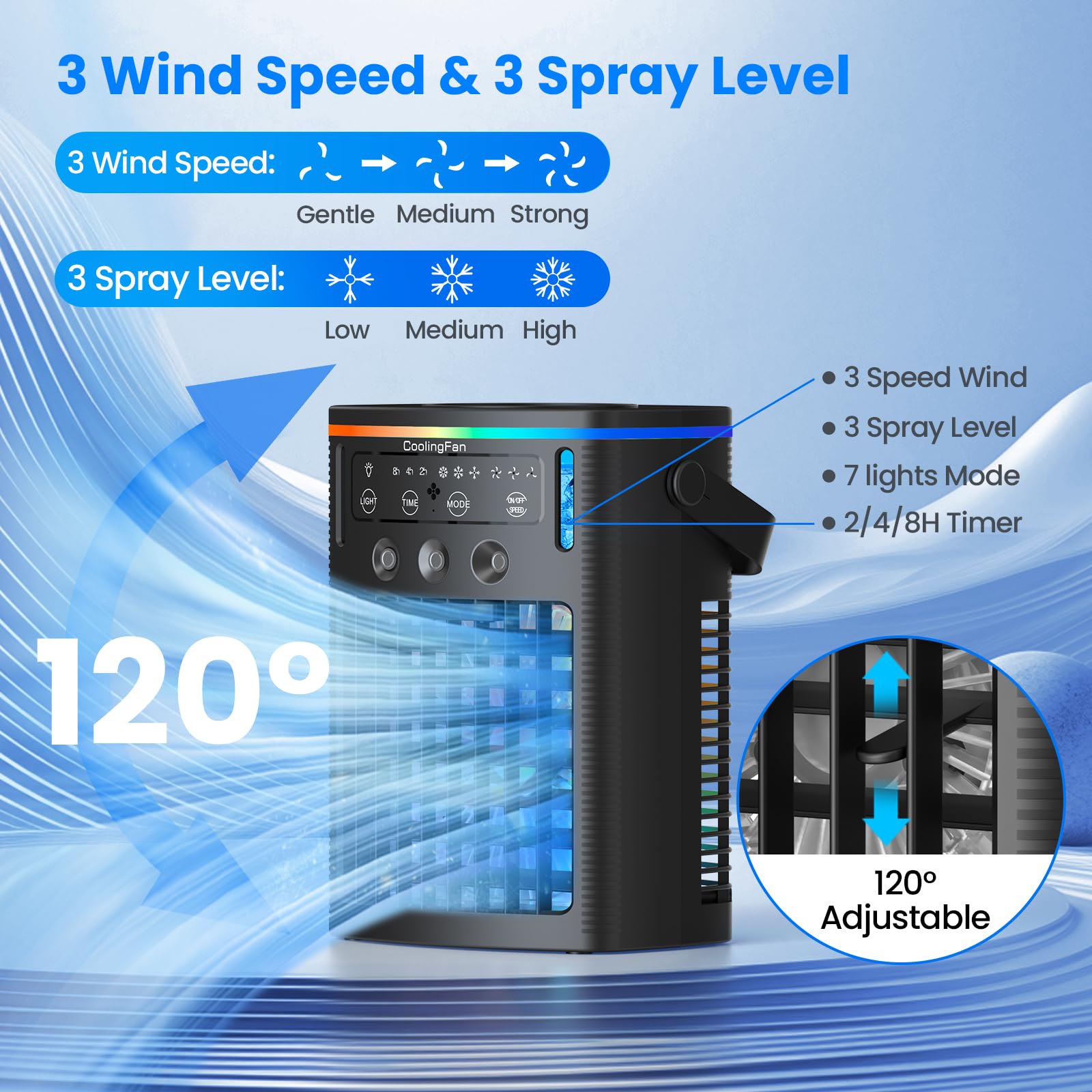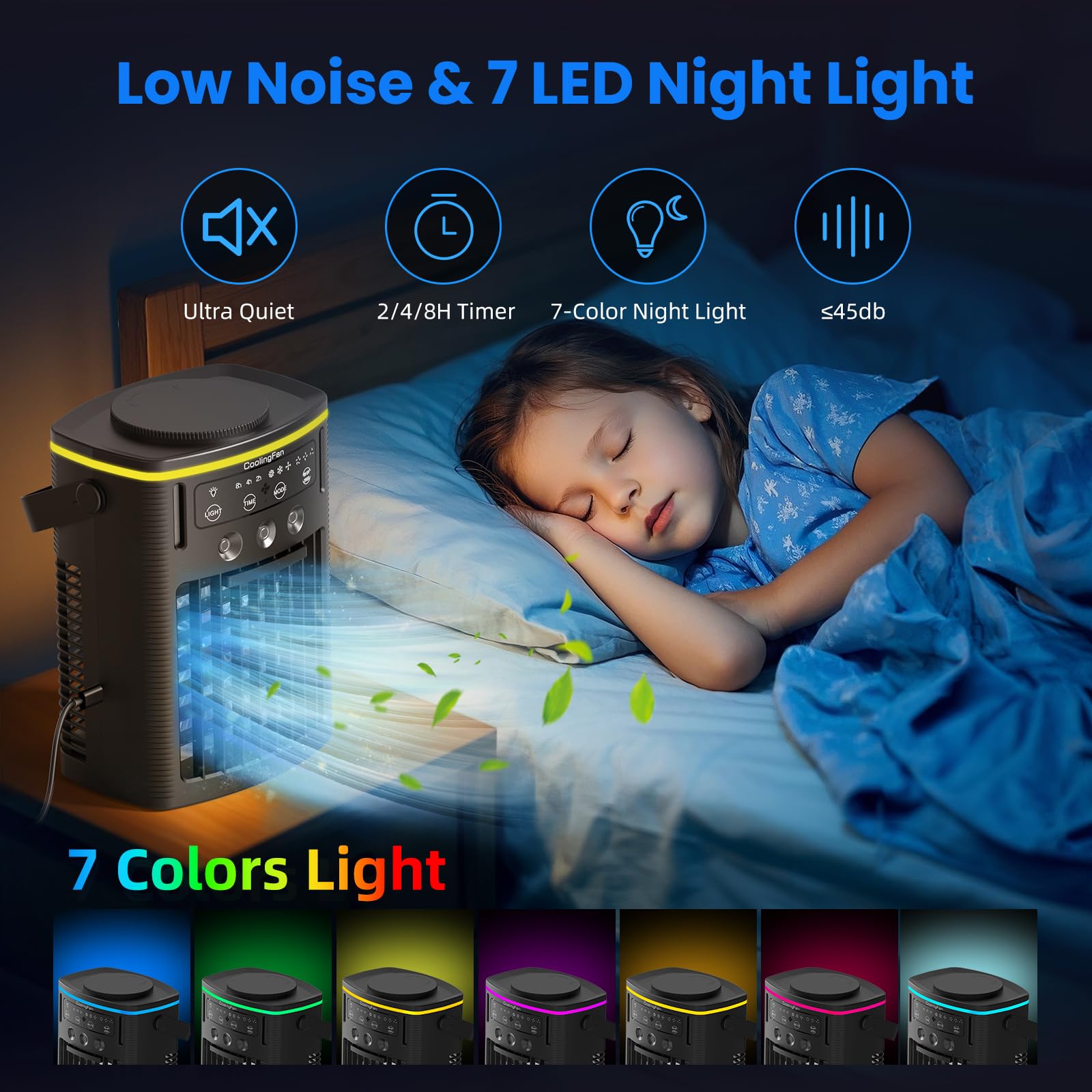 • 【4-in-1 Portable Air Conditioners】Our air conditioner portable can serve as an ordinary fan (no water or ice), cool mist humidifier (add water), portable air conditioner (add cold water &ice). Additionally, it features 7-color LED lights as a bedside lamp, providing a comfortable and relaxing sleep environment (The light can be turned off).