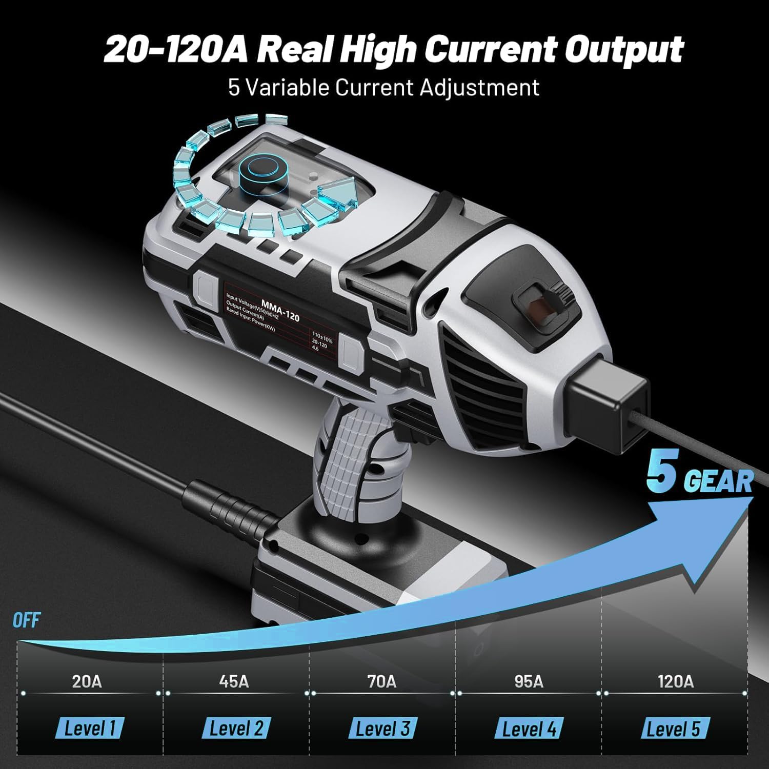• 20-120A Welding Stable Output: Welding machine 110V is equipped with 20-120A welding output adjustable,5-speed knob current adjustment to ensure that the project matches the required current.This versatile portable stick welder is perfect for a range of applications including home DIY, professional welding, and general repair work. It finds widespread use in machine building, goldsmithing, automotive repair, fencing, ironwork, hardware, and more. Experience the reliability and performance of welder for your welding needs