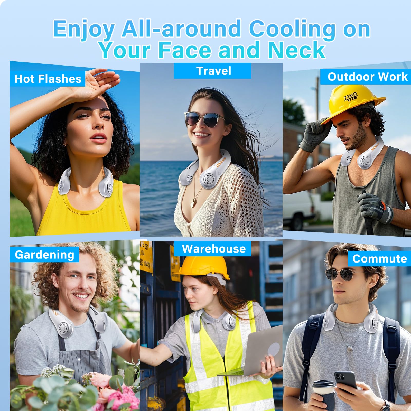 • 【Cool You Down Quickly】Our rechargeable neck fan is equipped with 74 wind outlets and 60pcs twin-turbine fan blades to ensure an instant burst of powerful airflow from the portable neck fan, let you experience a temperature drop off up to 20°F in just 2s! What's more, our neck fan features with air outlets on both sides and at the rear, which can full surround cooling for your neck, face, and even the back of your neck