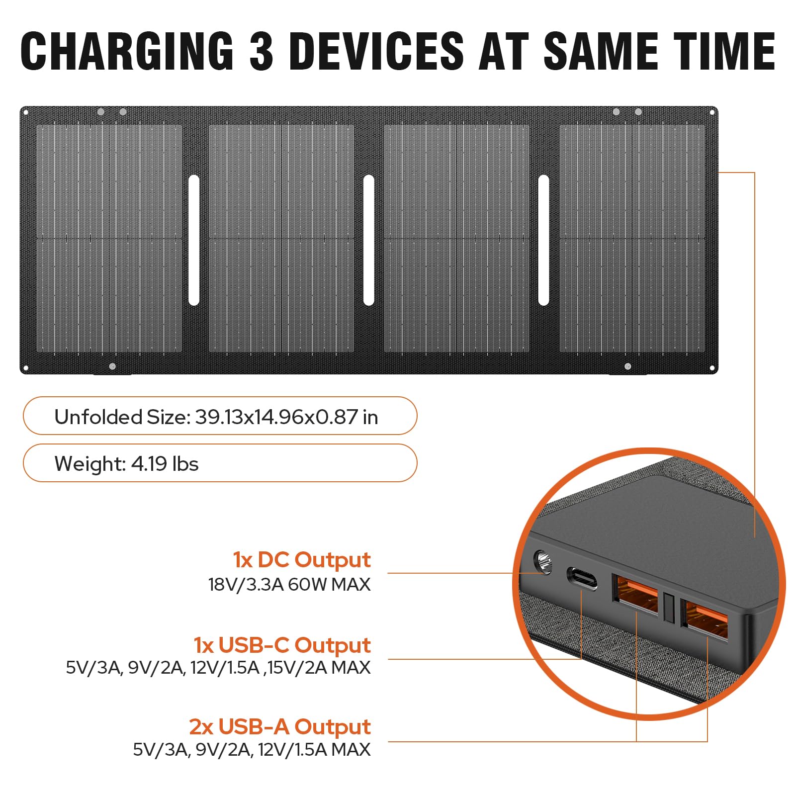 • MULTI-PURPOSE USAGE: Foldable solar charger 60W with USB-A output(5V/3A, 9V/2A, 12V/1.5A),USB-C output(5V/3A, 9V/2A, 12V/1.5A ,15V/2A Max), can charge for small devices including smartphones, tablets, digital cameras etc, Equipped with DC interface(18V/3.3A 60W Max), which can charge portable power station( NOTE: The junction box is not waterproof and please keep it dry)