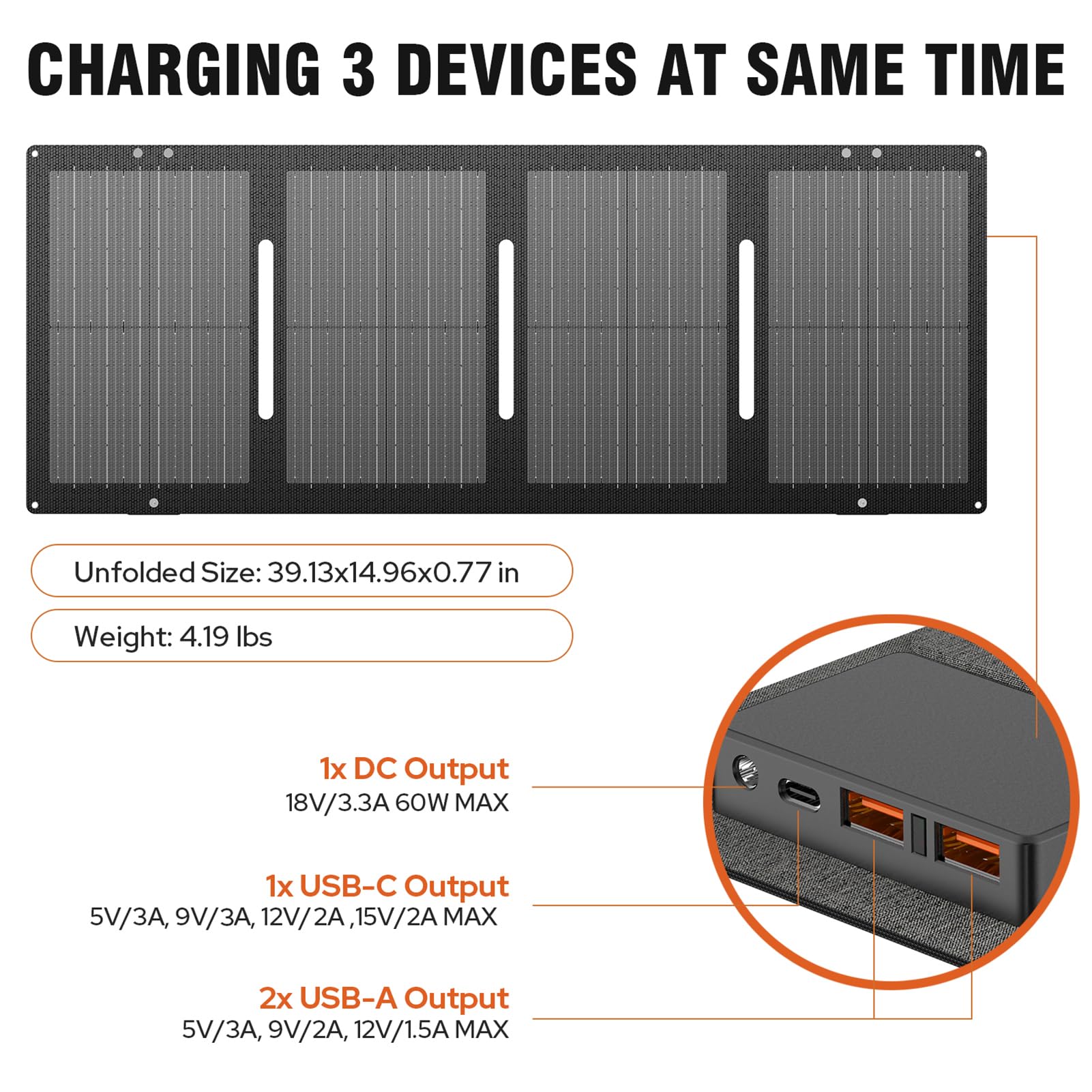 Details: Zerokor 60W Solar Panels with built-in Smart IC for USB Port The solar charger can automatically and quickly identify the current of your devices and speed up the charging process. Specifications: DC & USB Output Power: 60W(Max), Solar Cell Efficiency: 20.5% DC Output Voltage: 18V DC Output Current: 3.3A(Max) USB A Output: 5V/3A, 9V/2A, 12V/1.5A USB C Output: 5V/3A, 9V/3A, 12V/2A, 15V/2A Folded Size:14.96x 9.78 x 0.77in, Unfolded Size:39.13x14.96x0.077in, Weight: 4.2lb/1.9kg What's in the box? 1* 60W Solar Panel; 1* 10-in-1 Connect Cable; 1* DC-to-DC Cable(DC 5521 port(φ5.5mm, 2.1mm)); 1*User Manual 1*Carry Bag Tips for Use: ▸The output power will be affected by factors like weather conditions or the angle to the sun, please make sure that there is sufficient sunlight when you use the solar panel. ▸Please check whether the output voltage of the solar panel (18V) is in the range of the input voltage of your portable power station. ▸Please do not press the solar panel with heavy objects, or it will damage the chip inside