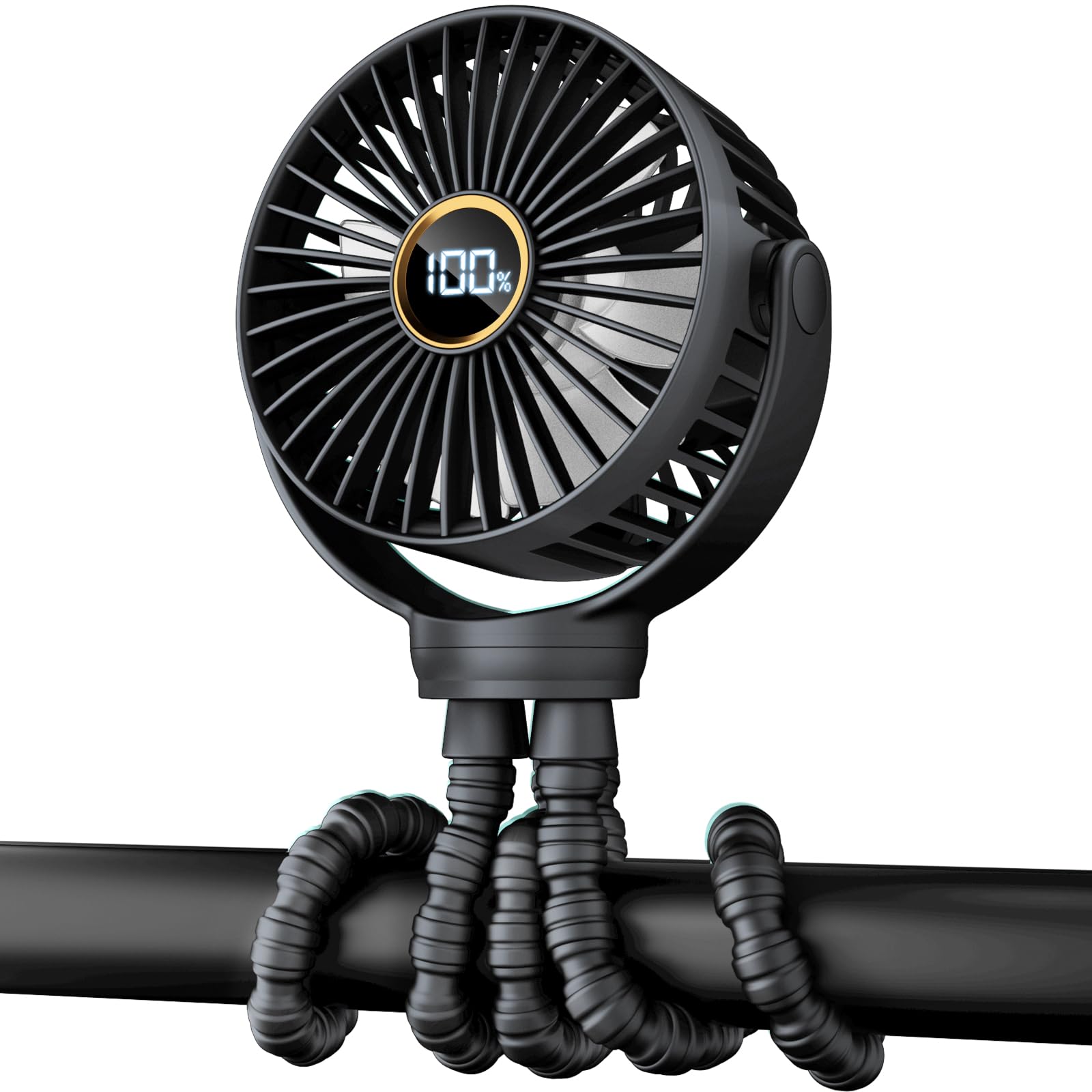Portable Stroller Mini Fan, Small Rechargeable Personal Fan, Baby Travel Essentials for Wagon, Car Seat, Treadmill, Battery Powered Biking Gear Accessories, 360° Rotation, 3-Speed, Display, Black