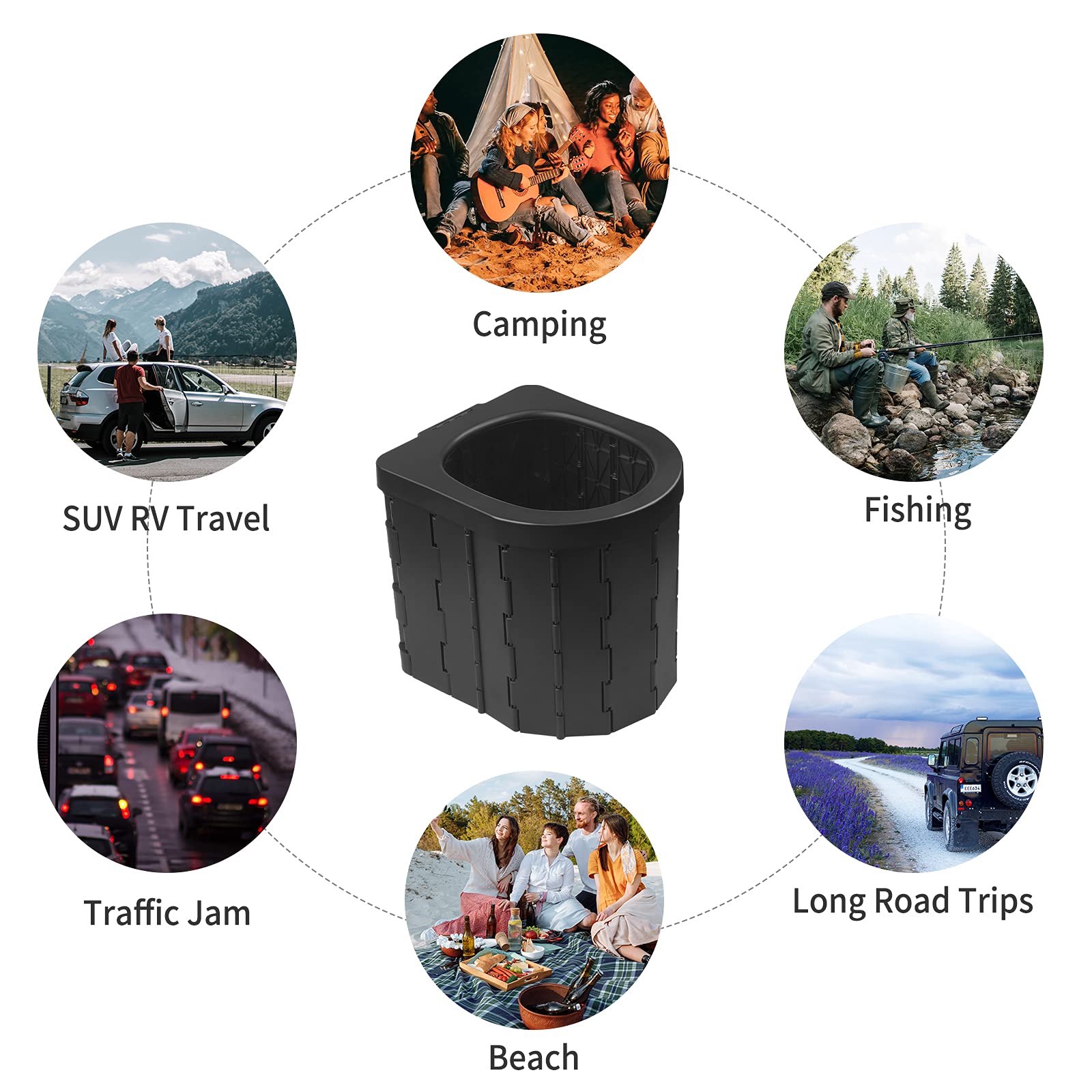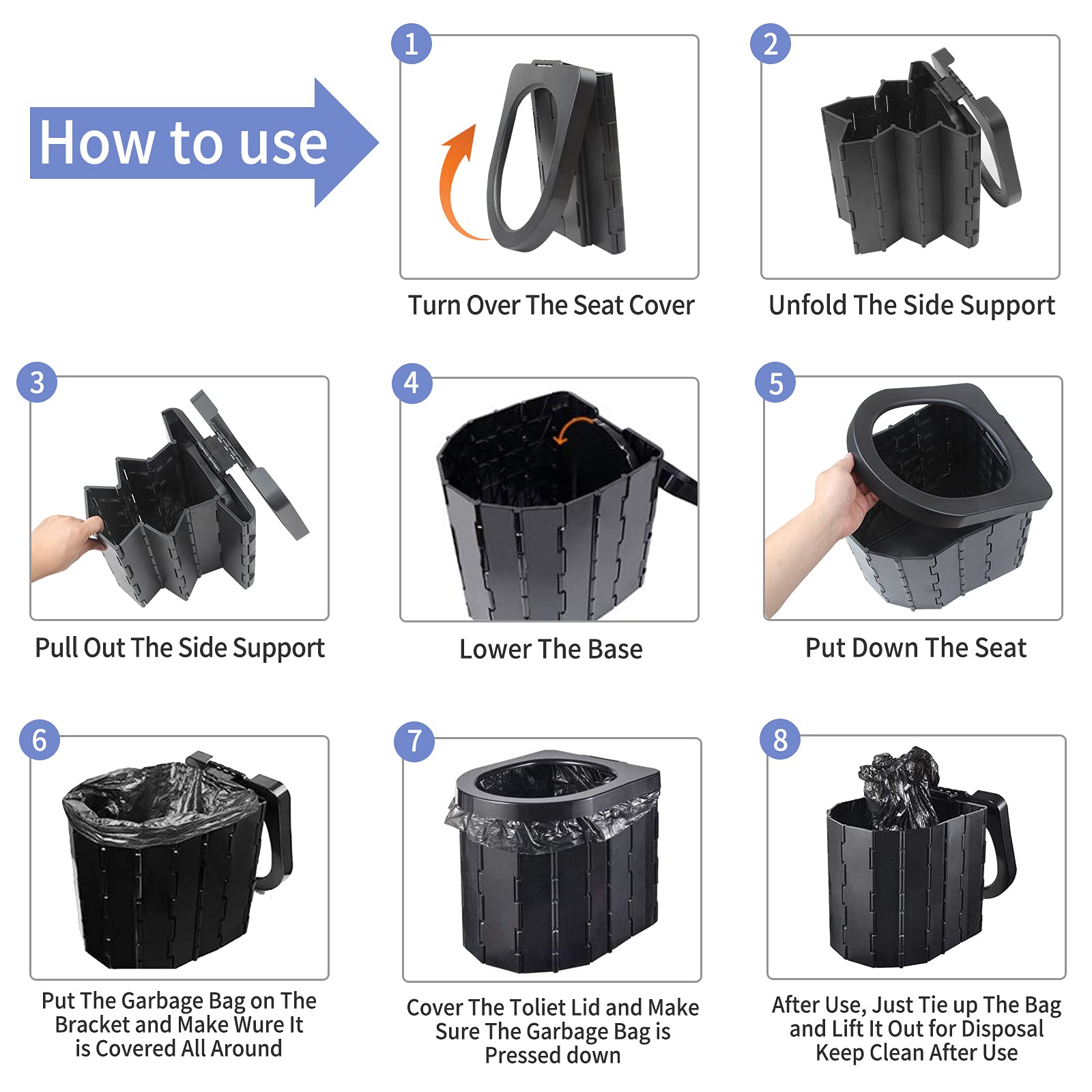 • Easy to Carry: The portable toilet is foldable and it is perfect for camping, hiking, backpacking, beach, riding, fishing, boating, marine, traffic jam, hunting, outdoor living, construction site, long road trips and anywhere for emergencies of needing a bathroom/restroom at any time.