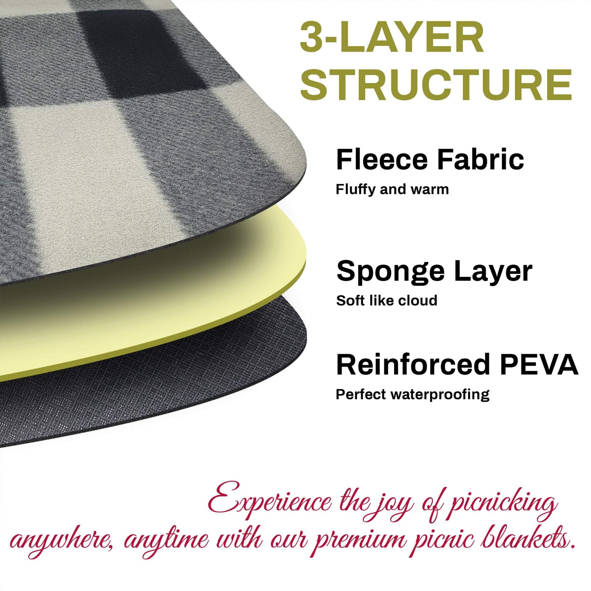 PortableAnd Picnic Blankets, 3 Layer Soft Fleece Blanket for Beach,Camping on Grass, Waterproof, Sandproof, Best Gift for Couple & Families, Black and Gray Checkered