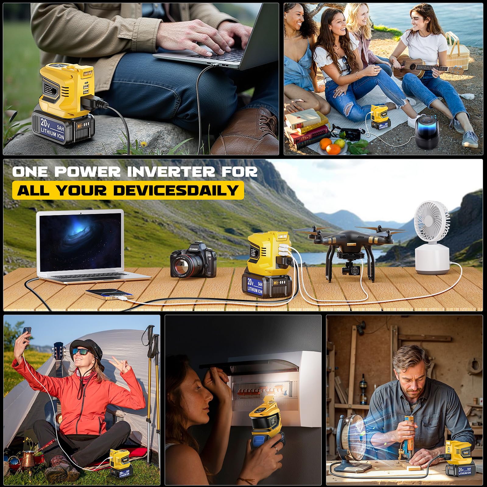 • Compatible With DeWALT Batteries: This battery inverter is compatible with Dewalt 20v max lithium-ion batteries DCB206 DCB205 DCB204 DCB181 DCB182 DCB200 DCB203 DCB205-2 DCB204-2 DCB206-2 and more. enabling it to power various outdoor camping appliances such as fans, ice makers, outdoor refrigerators, and other camping equipment. Pure sine wave can ensure that these devices operate stably and normally.