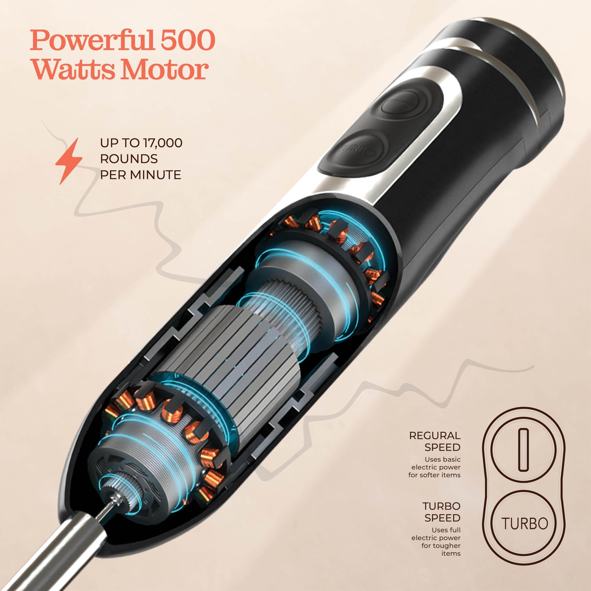 • Powerful Blender - The hand blender has a motor of 500 watts and 4 sharp blades, grinding unruly lumps, stubborn clumps, tough meats, and rock-hard fruits for smoothies, soups, milkshakes, and batters.