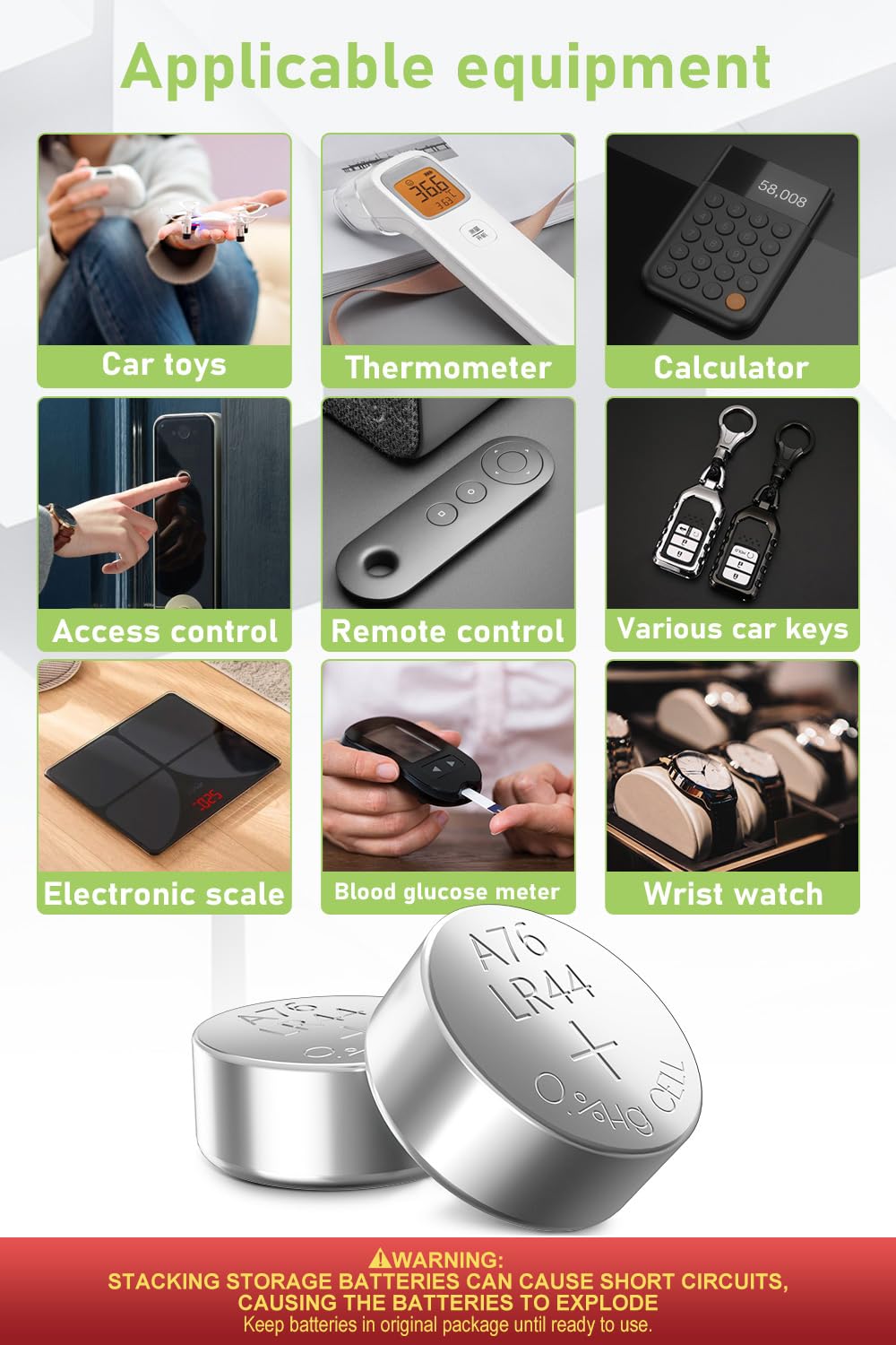 • Applicable to the following models: LR44,CR44,SR44,357,SR44W,AG13,G13,A76,A-76,PX76,675,1166a,LR44H,V13GA,GP76A,L1154,L1154F,RW82B,EPX76,SR44SW,303,SR44,S303,S357,SP303,SR44SW