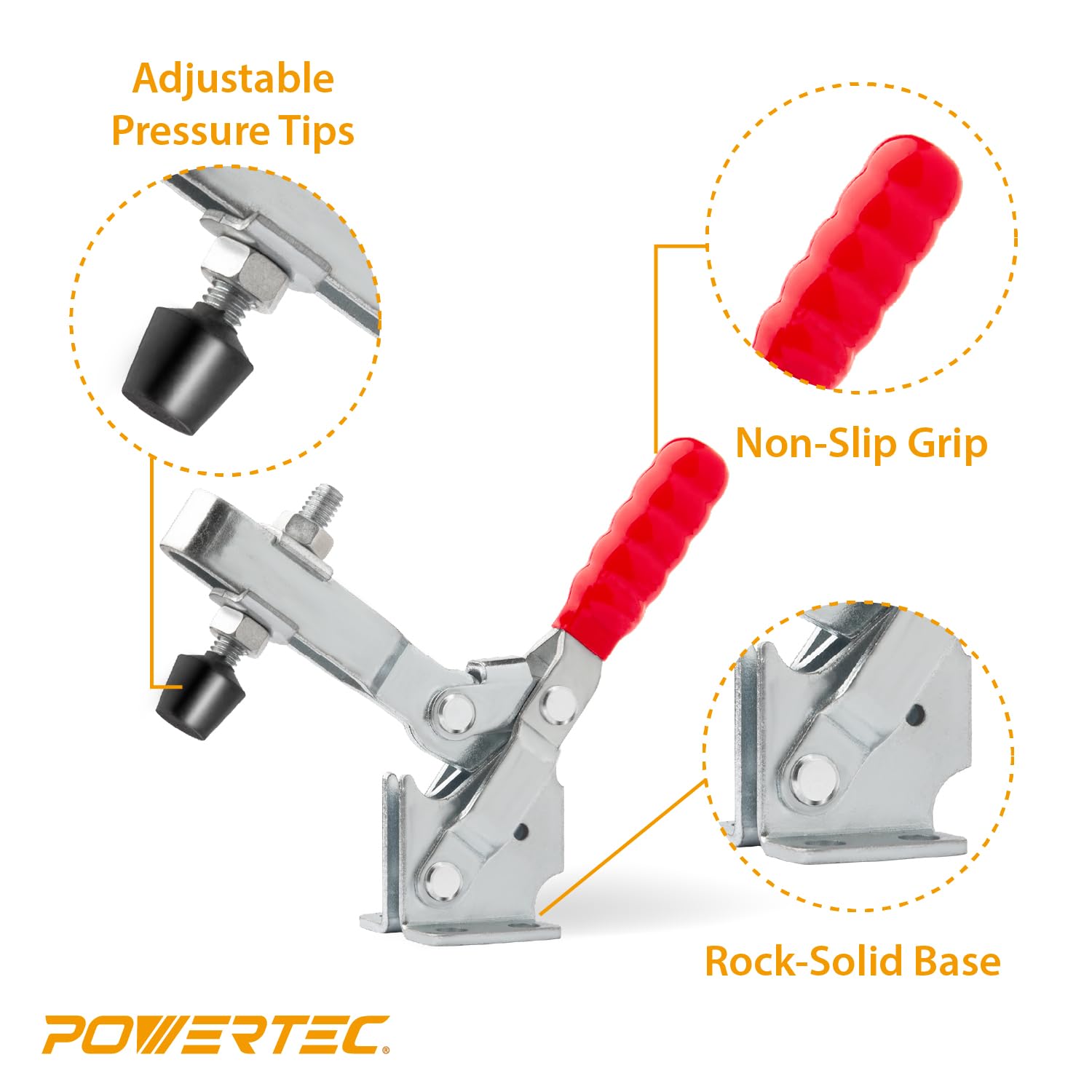 Details: introducing the Quick Release Vertical Toggle Clamp by POWERTEC. This clamp is an absolute must for any jig assembly, tool fixture or movable base. It features a vertical front mount push toggle design that provides an adjustable and secure hold, plus a quick release for many of your woodworking projects that require specific production clamping for drilling, welding or milling. Whether youre a professional or DIY type of person, some projects require that you handle clamps in a vertical position when space is an issue or horizontal clamps interfere. This clamp gives you an efficient solution and allows you to focus on getting things done with precision and speed. Holding Capacity: 200 lbs Premium Design Featuring both strength and adjustability, its high grade steel and vinyl colored grip handle allows for an easy, comfortable and safe operation. Even with its lightweight design, the toggle clamp flaunts heavyweight features, including a handy toggle mechanism that allows for maximum clearance, along with a flange base and 90-degree angle grip that gives you maximum control. Its already superb construction is enhanced with a zinc plated coating for corrosion resistance and optimized durability. Common Uses Table Saw Jigs and Fixtures Smoker Grills More