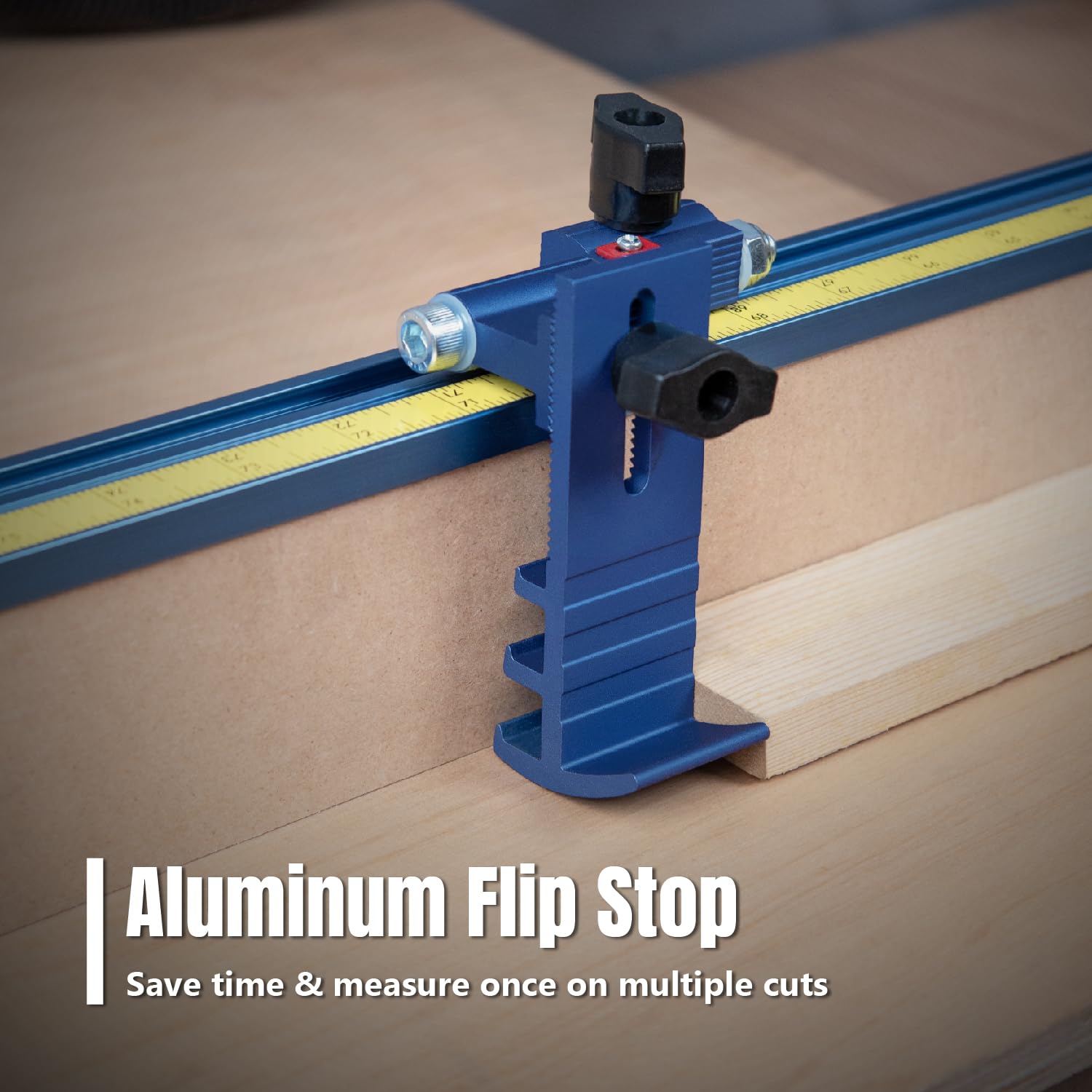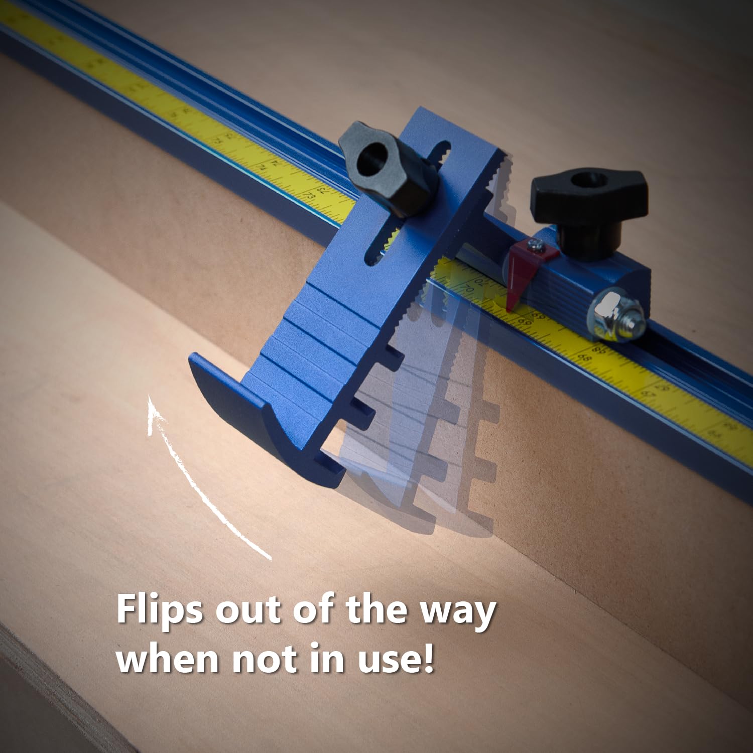 FEATURES: The flip stop locks tight (no wobbling.) and can be used on either side, allowing you to set precise measurements on both sides of your workstation. The length of the flip arm can be adjusted from 3” to 1-1/2”. Plus, a built-in scale and adjustable pointer make measuring cuts a breeze. The self-adhesive tape measure has two sets of numbers and can be read either left to right or right to left.