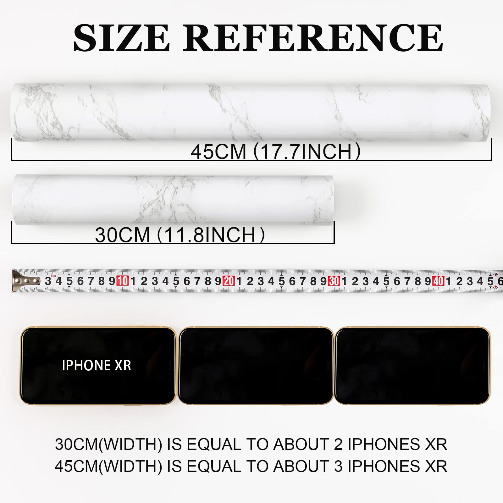 • Glossy Marble Wallpaper: Colors are white and gray with a hint of brown due to lighting. Size is 11.8 inches X 78.7 inches. Before purchasing, be sure to measure your own size. This is our minimum size, when purchasing, please confirm if this size meets your needs and we have more large sizes for you to choose from. Material is PVC, self adhesive, no additional glue required. Material upgraded, thickened and wear resistant, realistic marble effect