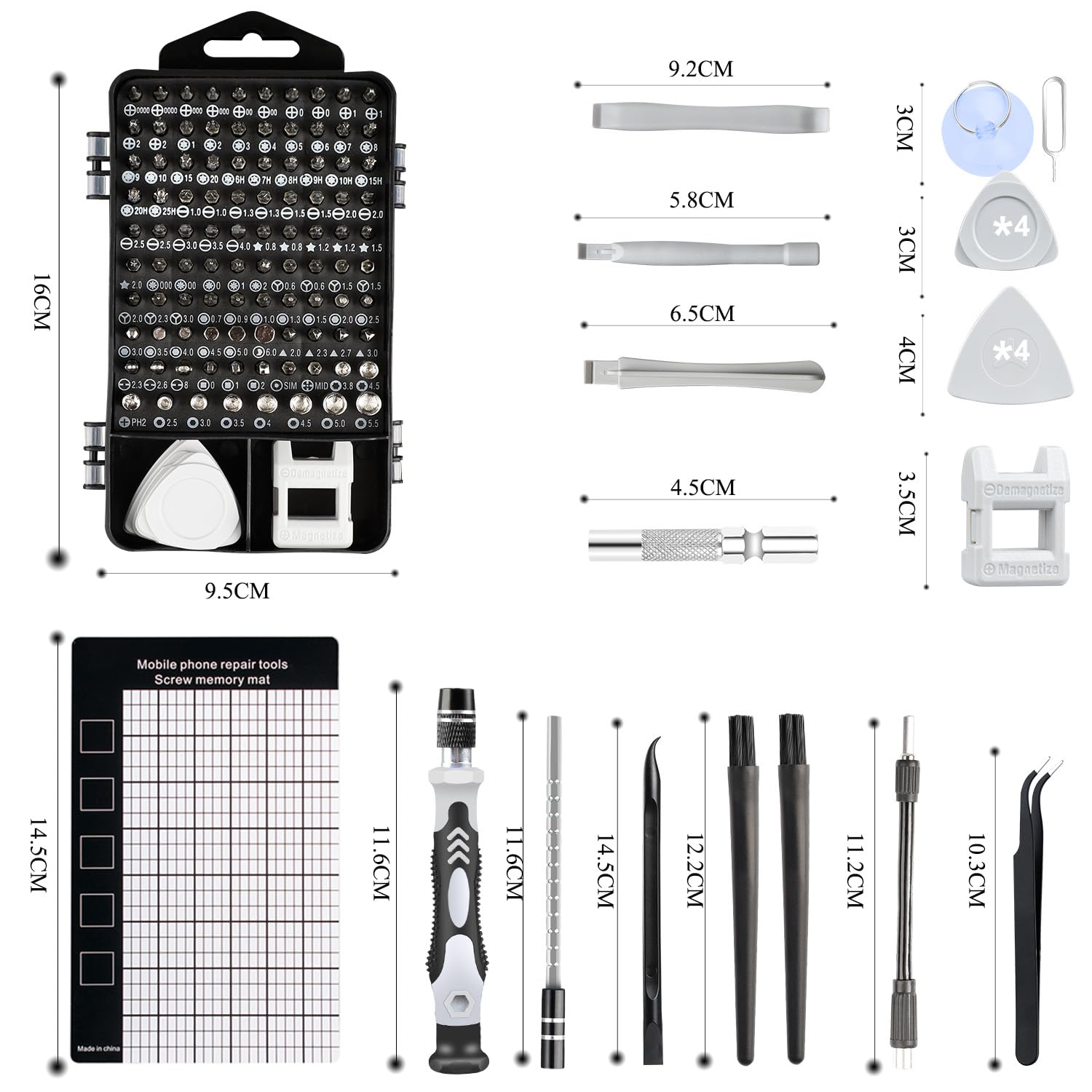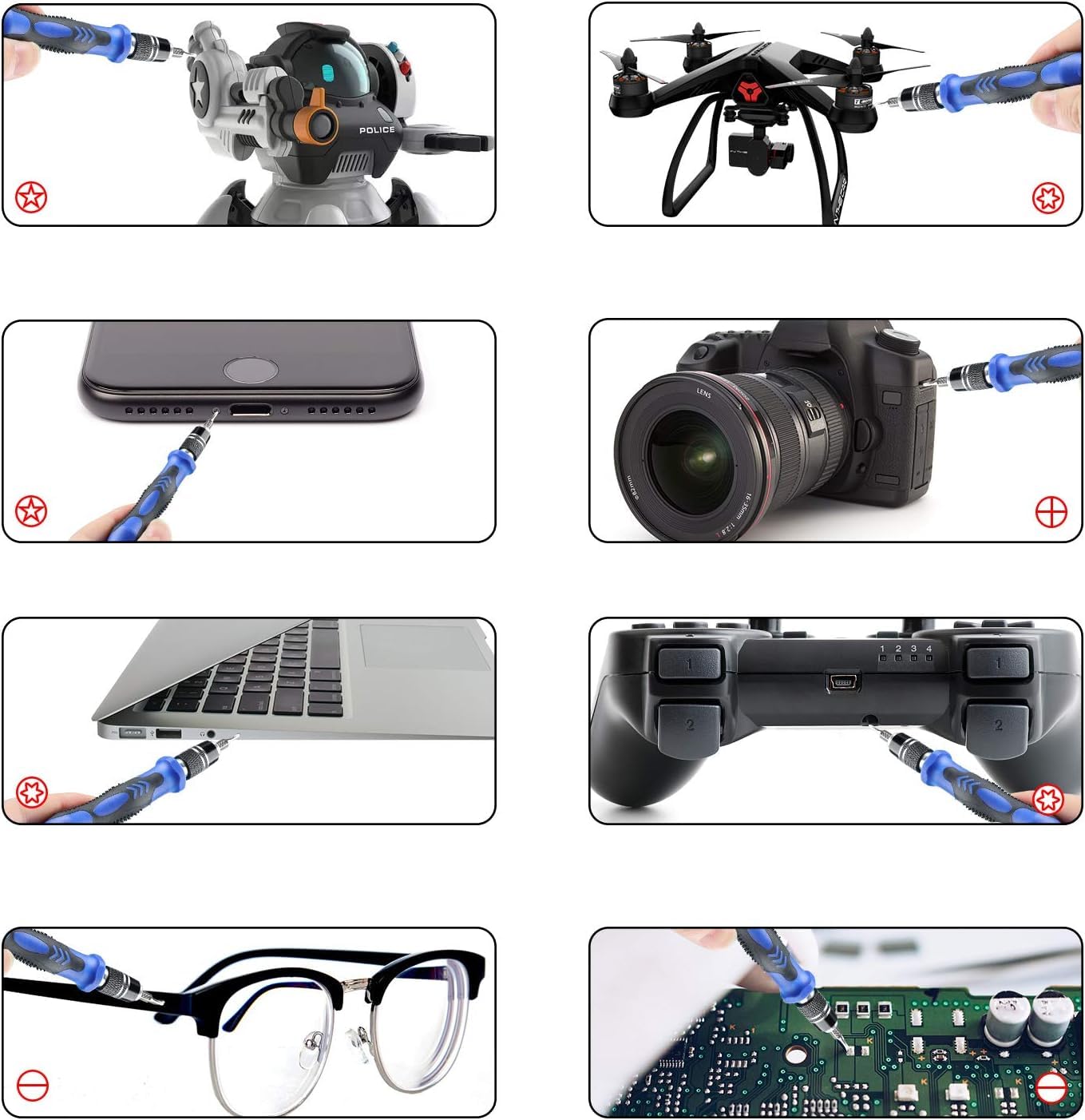 • 【Multipurpose & Good Compatibility】This precision computer repair kit has 16 types and 38 bits screwdriver, such as Phillips,ph2,torx,fivestar,straight, pozidriver, y, torx, triangle, hexagon and square bits. from the laboratory data, it contains all screw drivers for iPhone 11 to 4, samsung galaxy cellphone, laptop, iPad, Nintendo switch Wiiu and ps3 ps4, xbox one series game switch, and this repair kits also contains the screwdrivers for eyeglass, jewelers,Drone, PC and other electronics.