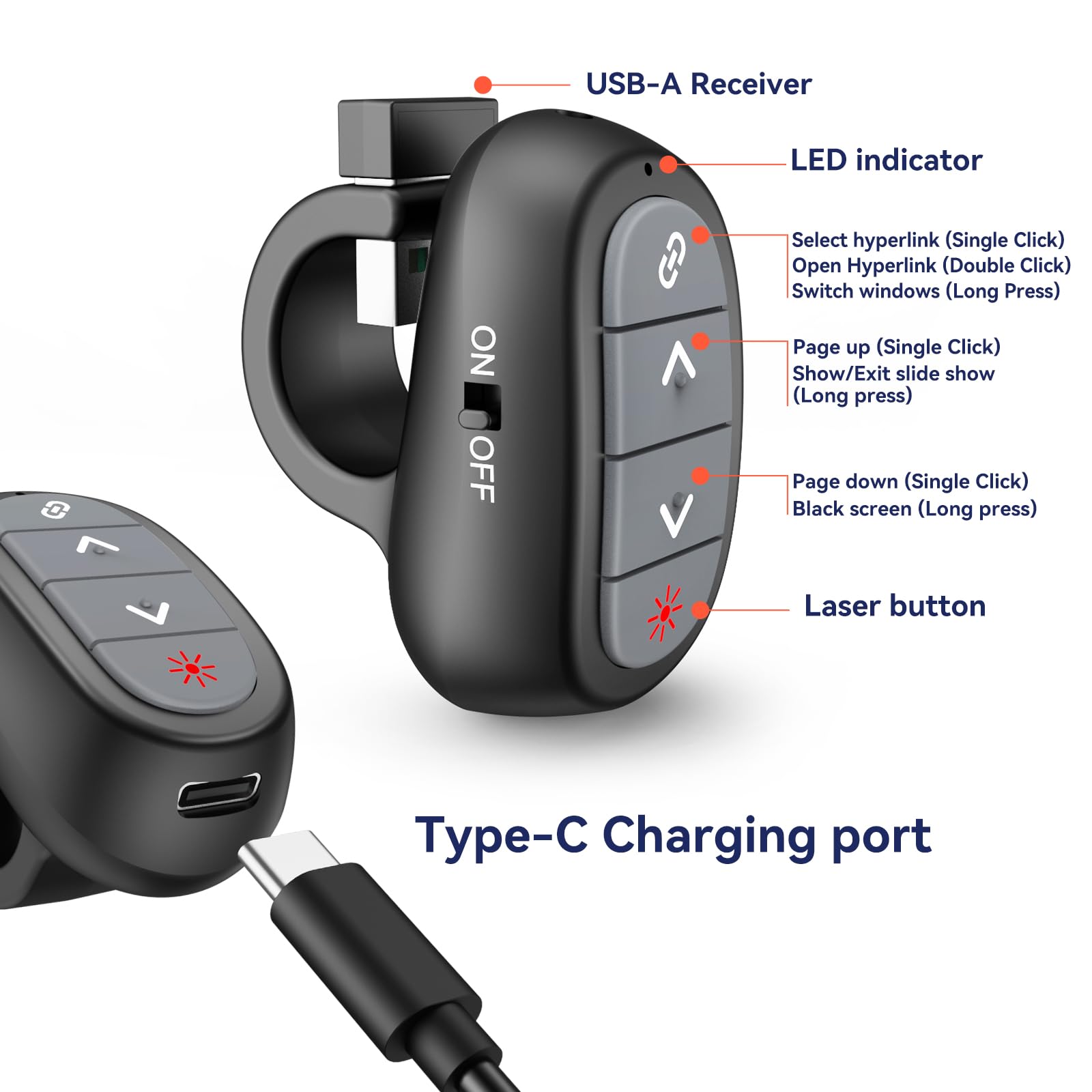 • Innovative Finger Ring Design: Stand out with a practical finger ring clicker. Keep your hands free, avoiding the trouble of misplacing your wireless presenter. The adjustable ring design ensures a comfortable fit for all finger sizes.
