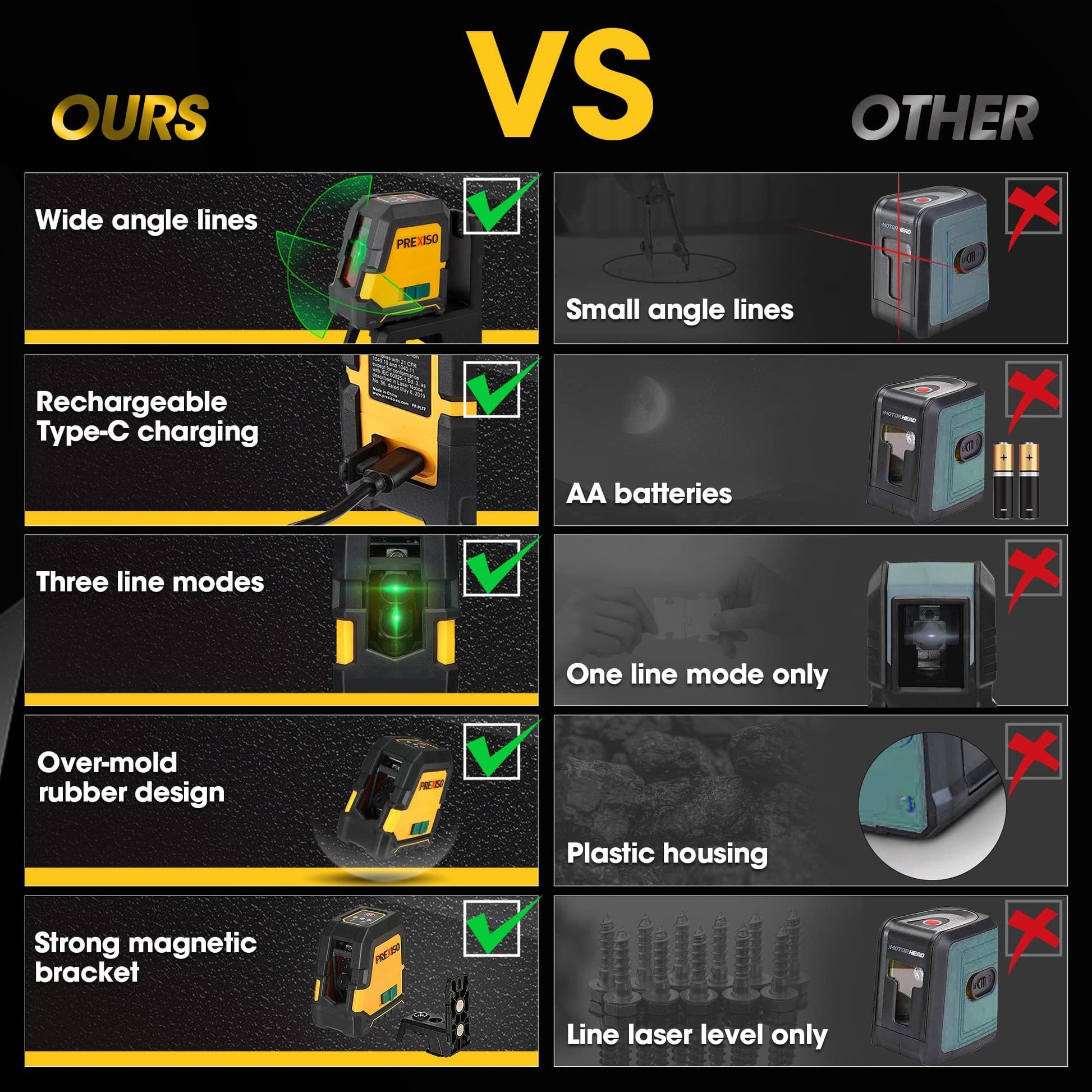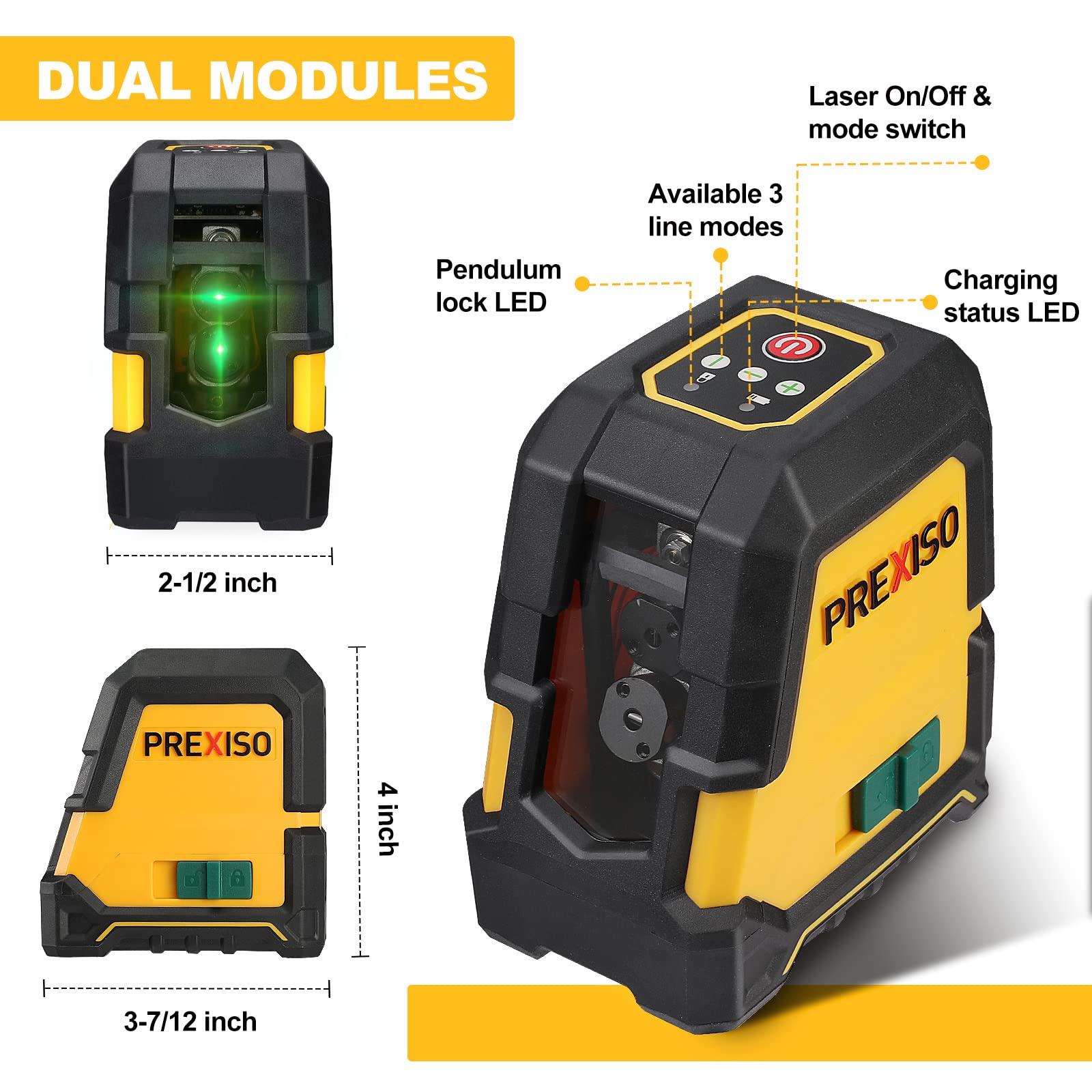 • Dual Modules & 3 Projecting Modes: PREXISO line laser has two laser sources. Laser level with the professional laser head is more accurate. Projects bright horizontal, vertical & cross 3 modes ​lines onto flat surfaces and levels, stable than other common equipment
