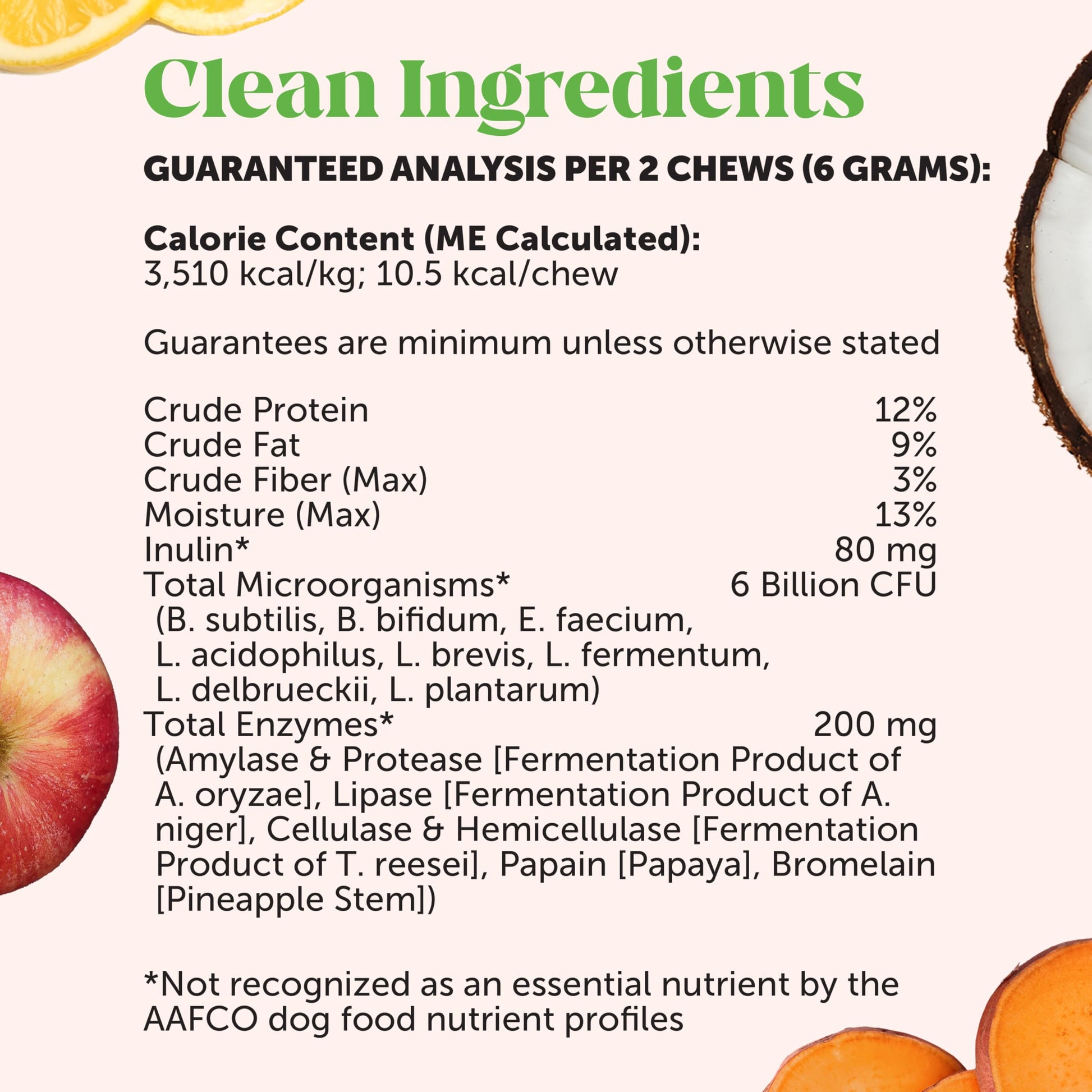 • THE INSIDE STORY: These soft chews are formulated with probiotics, the “good bacteria” that support digestion, gut & immune health. This is also a probiotic for dogs itching & licking paws. Plus, it supports sensitive stomachs with prebiotics for dogs that boost probiotics, & fiber that promotes regularity & a healthy gut microbiome. Sweet potato & pumpkin are also in the mix for added fiber & nutrients, as well as enzymes that help digestion & overall health.