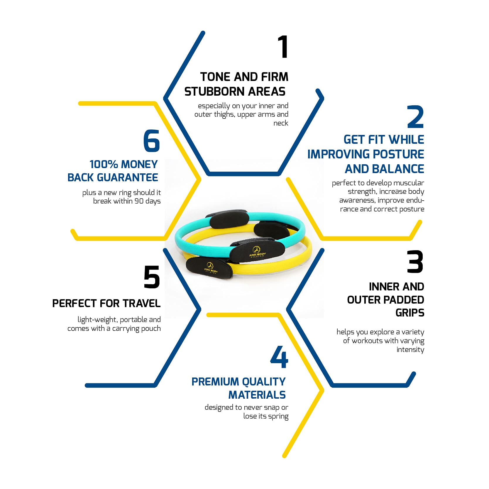• GET FIT AND STRONG: Essential to your Pilates equipment for home workouts. This Pilates ring for women will improve your muscle tone and fitness when you practice regularly, at home, office or when traveling.