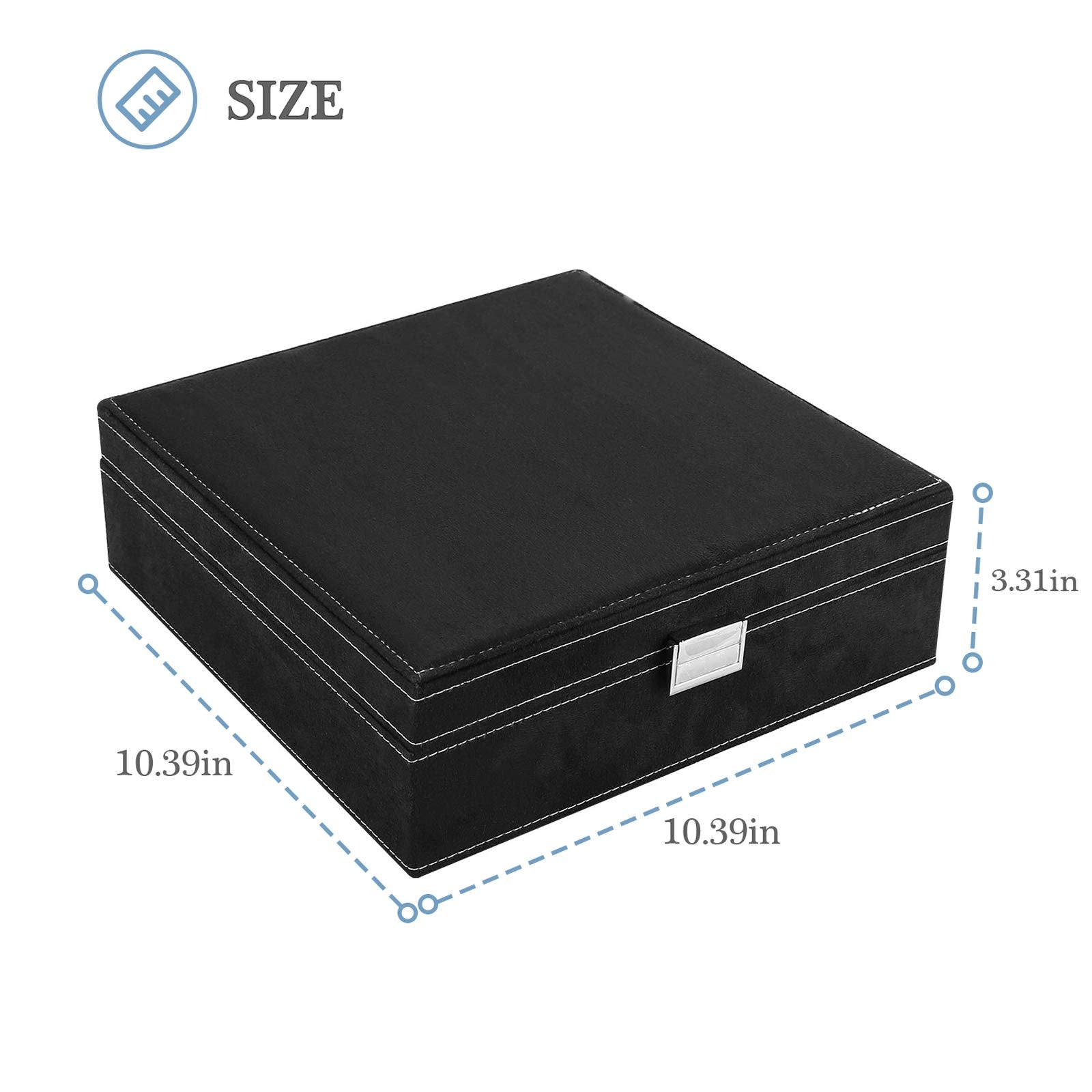 • Jewelry box dimension: 10.39' x 10.39' x 3.31'; Double stackable layer design with 27 different sized compartments for organizing all types of jewelry, including earrings, bracelets, rings necklaces, etc.