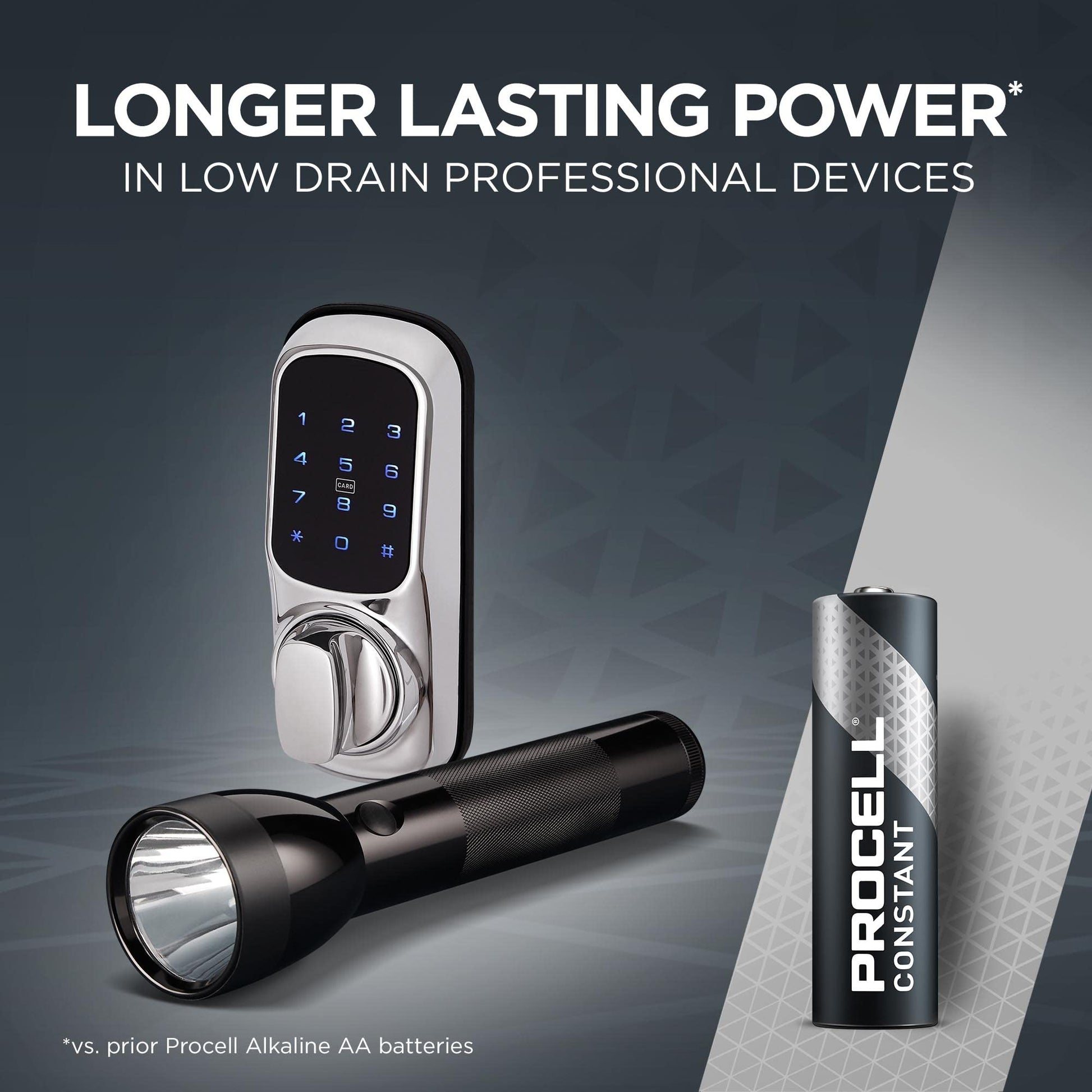 • LONG LASTING POWER – AA 1.5-volt batteries deliver longer lasting power vs. prior Procell Alkaline AA batteries; Procell Constant batteries are formulated for low drain devices like alarm panels, motion sensors, smoke detectors, remote controls, blood monitors, glucometers, flush valves, and more