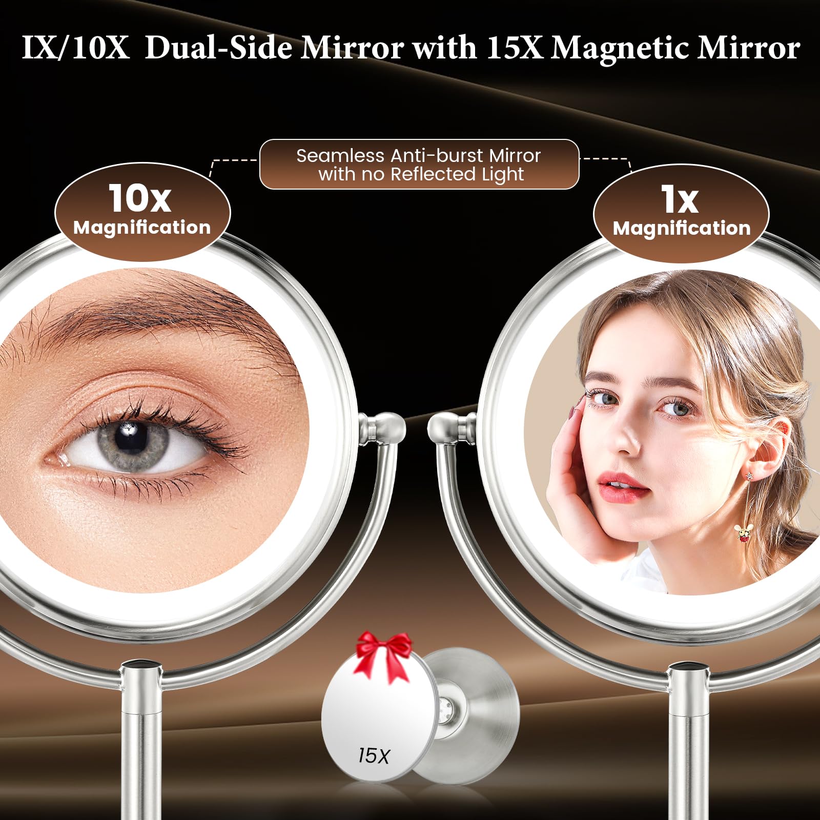 • 【True 1X/10X/15X HD Magnification, Oversized Zero Optical Distortion Mirror】1X/10X/15X Sides achieve over 10 Million Pixels HD Mirror Effect. 8.5 inch extra-large size 1X mirror offers a wide-angle view to pair hairdos with makeup. Easily rotate to the 10X/15X magnifying side, uses the optical principle of No Pixels Loss Magnification to ensure zoom in on every facial details without distortion. Enjoy meticulous makeup and skincare with a lighted mirror with magnification!