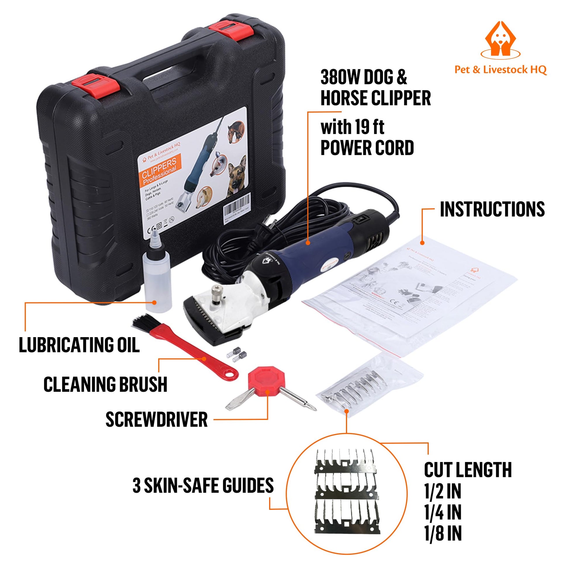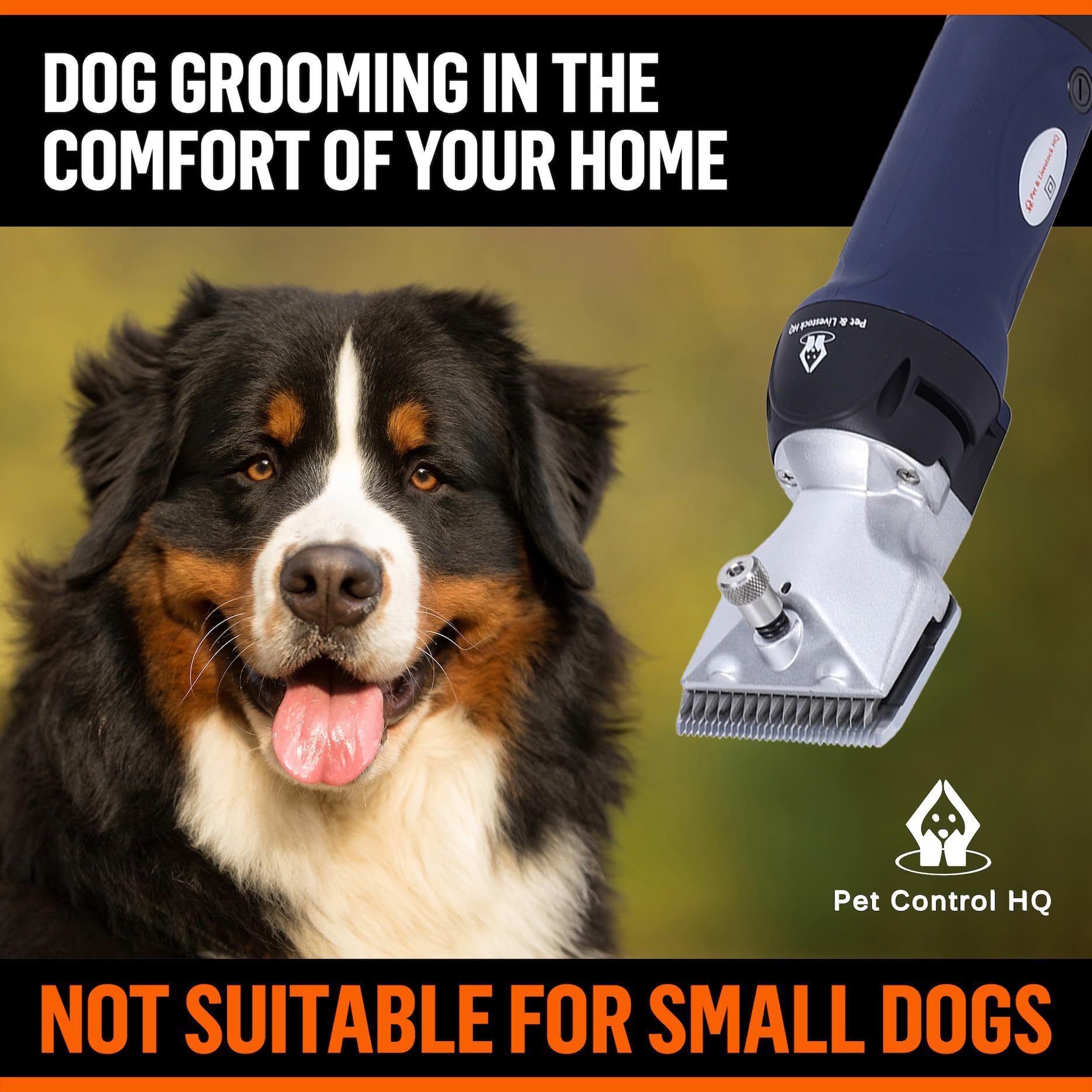 • Large dog grooming shears: Pet & Livestock HQ clippers for dogs have rugged polymer body to reduce vibration and the airflow vents keep blades cool to avoid the nasty burnt hair smells or seared skin. These pet hair clippers are designed for big dogs 25-inches or taller, and you can easily adjust the cutting distance to safely float the cutting blade above sensitive skin for smooth shearing