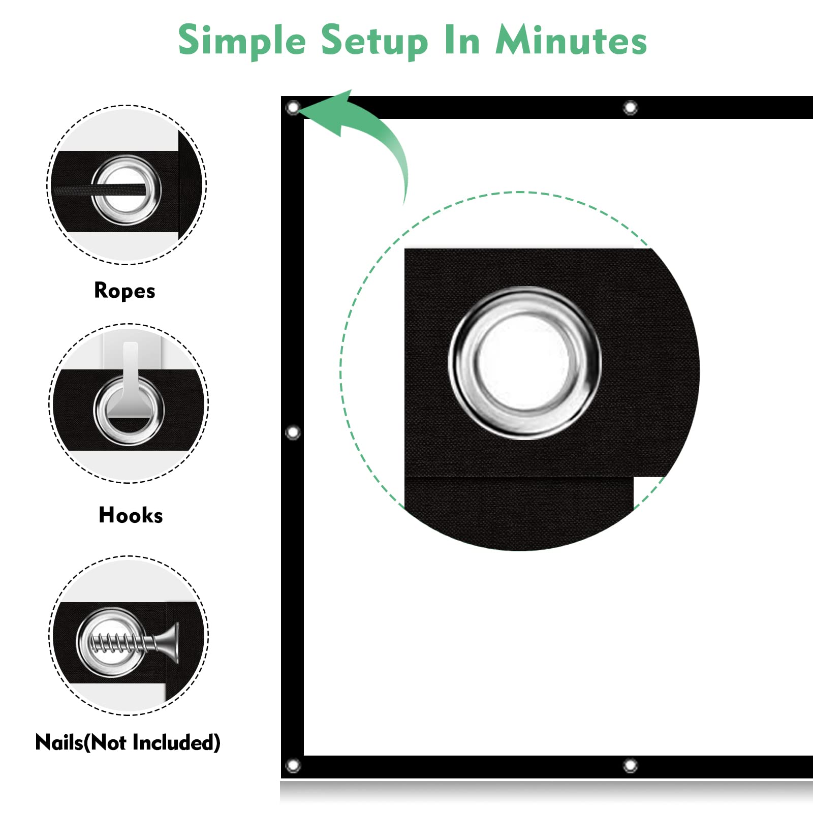 • Portable and Easy Installation - This video projection screens can be folded in small size and put it in your backpack or suitcase without any damage, and then take it to wherever you want with storage bag. Most important, this movie screen for outdoor use coming with all the necessary tools(hooks,ropes and stickers), just need 5 minutes to set up, and the whole process was not complicated, can be done by yourself.