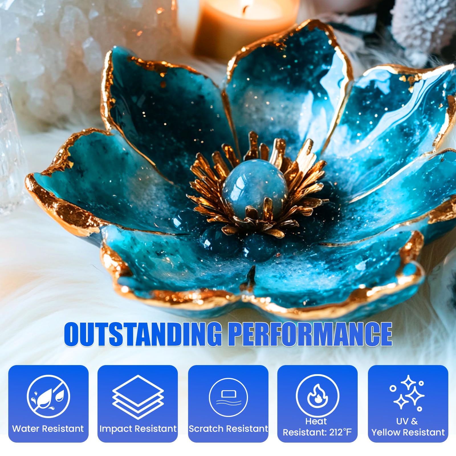 • 【Crystal Clear & High Gloss】ProKKUV epoxy resin is its crystal-clear finish. Once cured, the resin exhibits remarkable clarity, which is crucial for applications like jewelry making and art pieces. It can resist heat, scratch and keep clear without yellowing, protecting your beautiful artworks and colors for stable and long-lasting