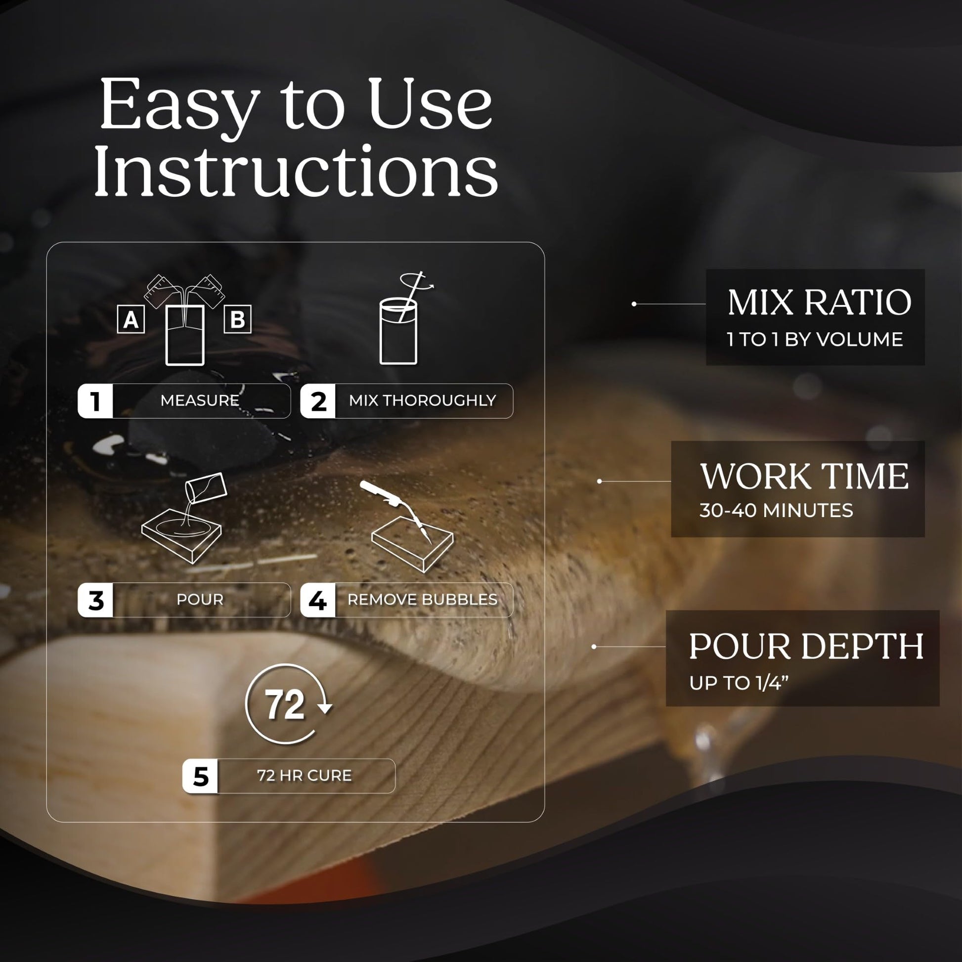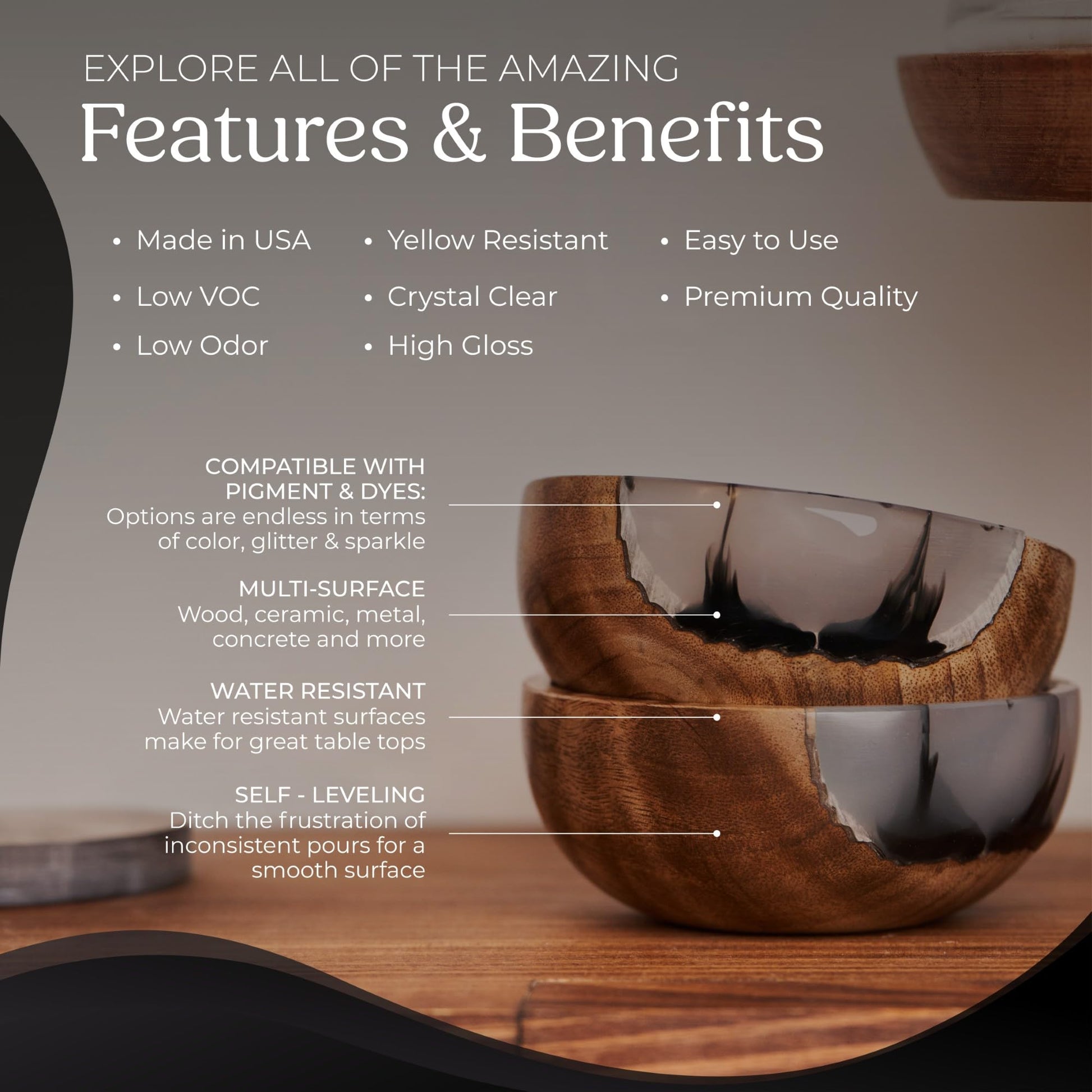 • Self-Leveling Epoxy - Say goodbye to uneven pours with our self-leveling epoxy resin. Ideal for bartops, craft tables, countertop epoxy, and more, our resin guarantees a sleek, high-gloss finish.