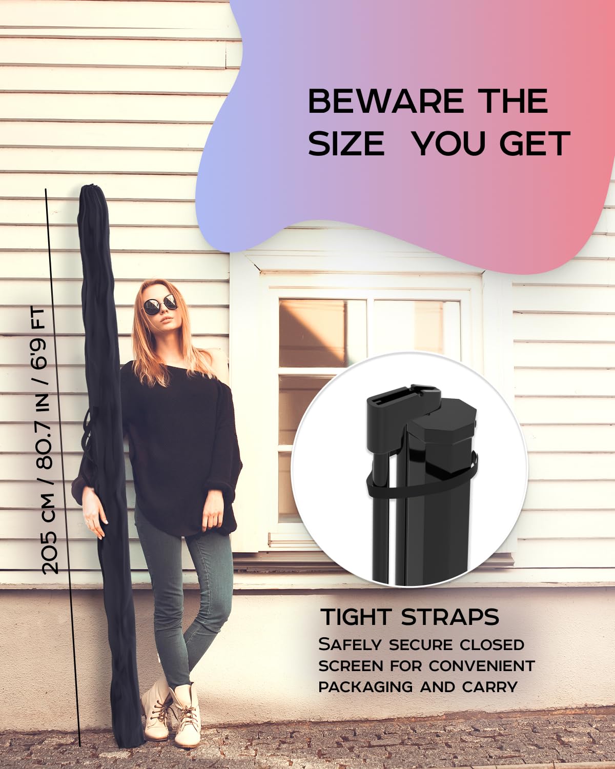• Indoor Outdoor projection movie screen is secured by convenient tight-straps, it could be carried to backyard or auditorium in a perfectly fitted projector screen bag, its retractable and adjustable design can be easily assembled in 3 steps