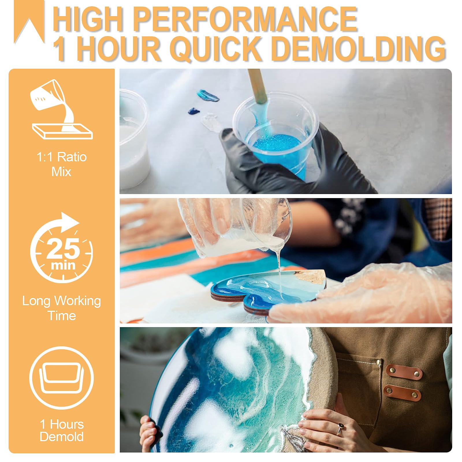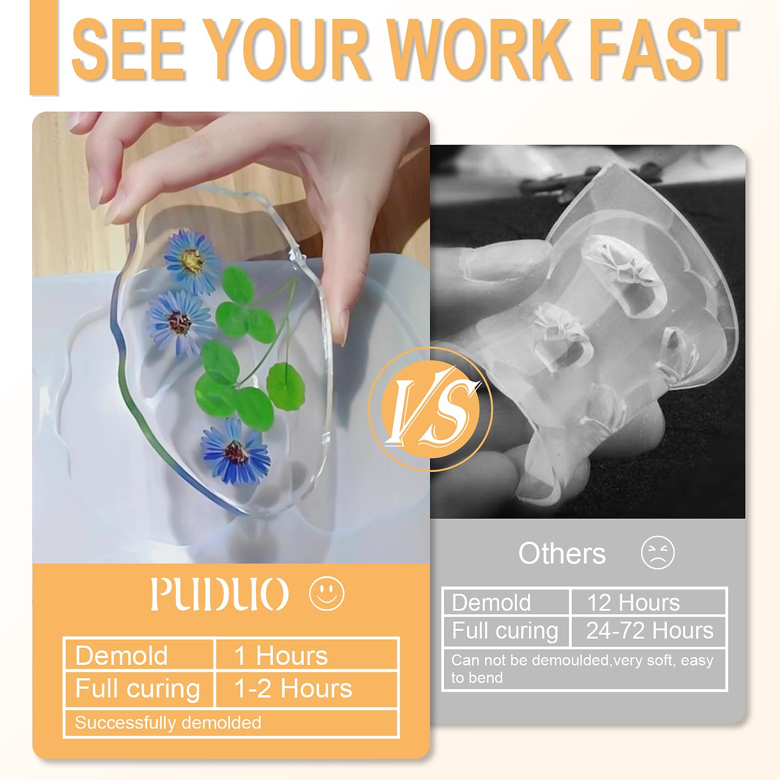 • 1 HOUR DEMOLD EPOXY RESIN - PUDUO brand new upgraded formula epoxy resin is capable of 1 hour rapid film removal with a simple 1:1 mix and 20-25 minutes of work time for professional results and amazingly fast curing in 1-2 hours.