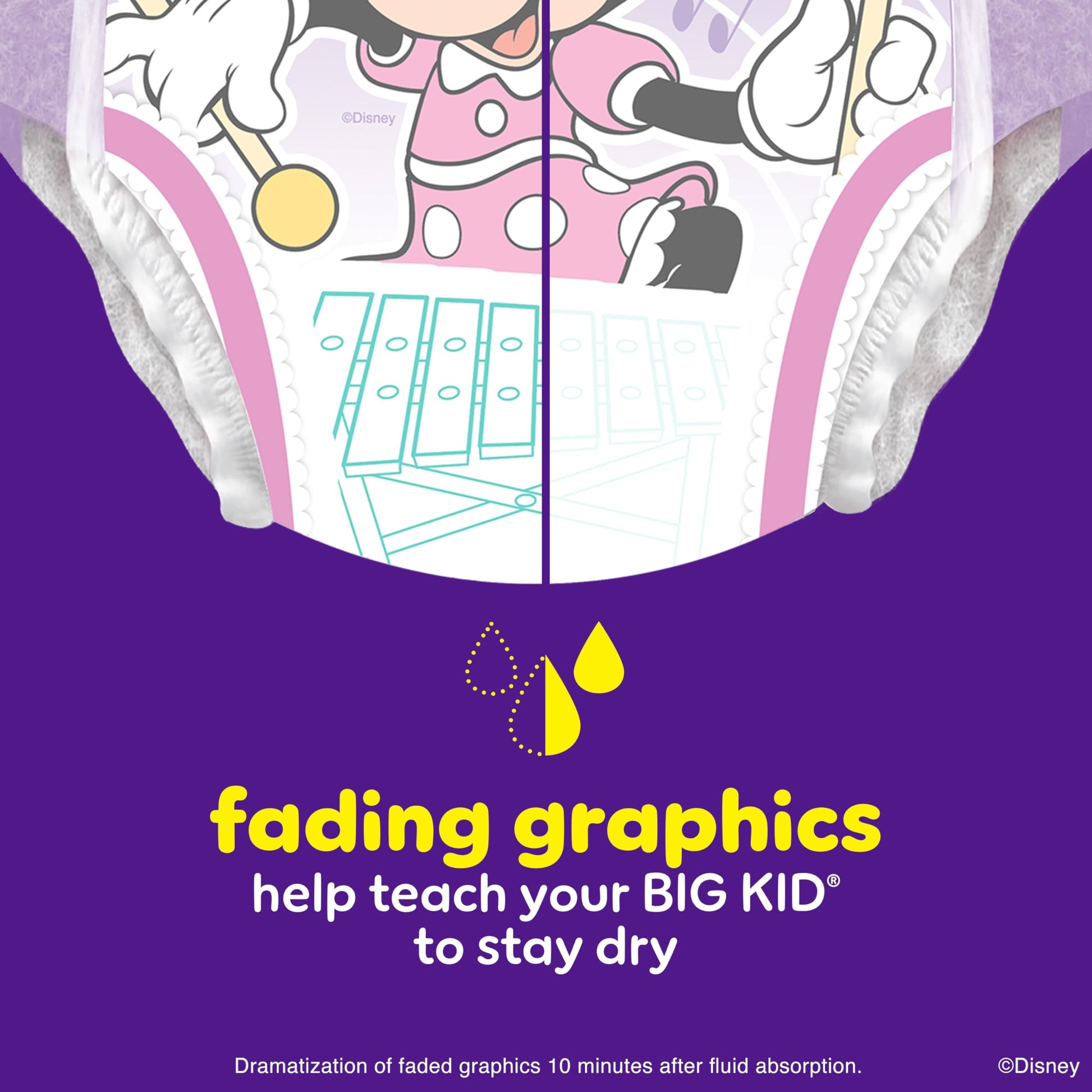 Details: Build Big Kid confidence while potty-training with Pull-Ups Training Pants for Girls Up to 100% leak-free where girls need it most, Pull-Ups training pants back them up so misses don’t become messes Designed with soft and breathable materials and a wide, stretchy waistband, Pull-Ups potty training underwear help your child be comfortable. To help foster Big Kid independence, these potty training underwear go up and down fast like undies, building Big Kid confidence as you potty train. Easy open, refastenable sides help to make changing the pull up quick and easy, even when you are on-the-go. These training pants also feature toddler loved designs from Disney’s Minnie Mouse. Only Pull-Ups has Disney designs to get your Big Kid pumped for potty training. Fading graphics help teach your Big Kid to stay dry. To help them stay motivated, tell your Big Kid a story that Minnie loves making music and you can help keep the music going by staying dry When your child is ready to begin her potty training journey, the Pull-Ups brand can help. Visit the Pull-Ups website for expert potty training tips and resources. We’ve helped train 60 million Big Kids and counting* Pull-Ups Girls Training Underwear are available in sizes 2T-3T (16-34 lbs), 3T-4T (32-40 lbs), 4T-5T (38-50 lbs) and 5T-6T (50+ lbs). (*US and CA).