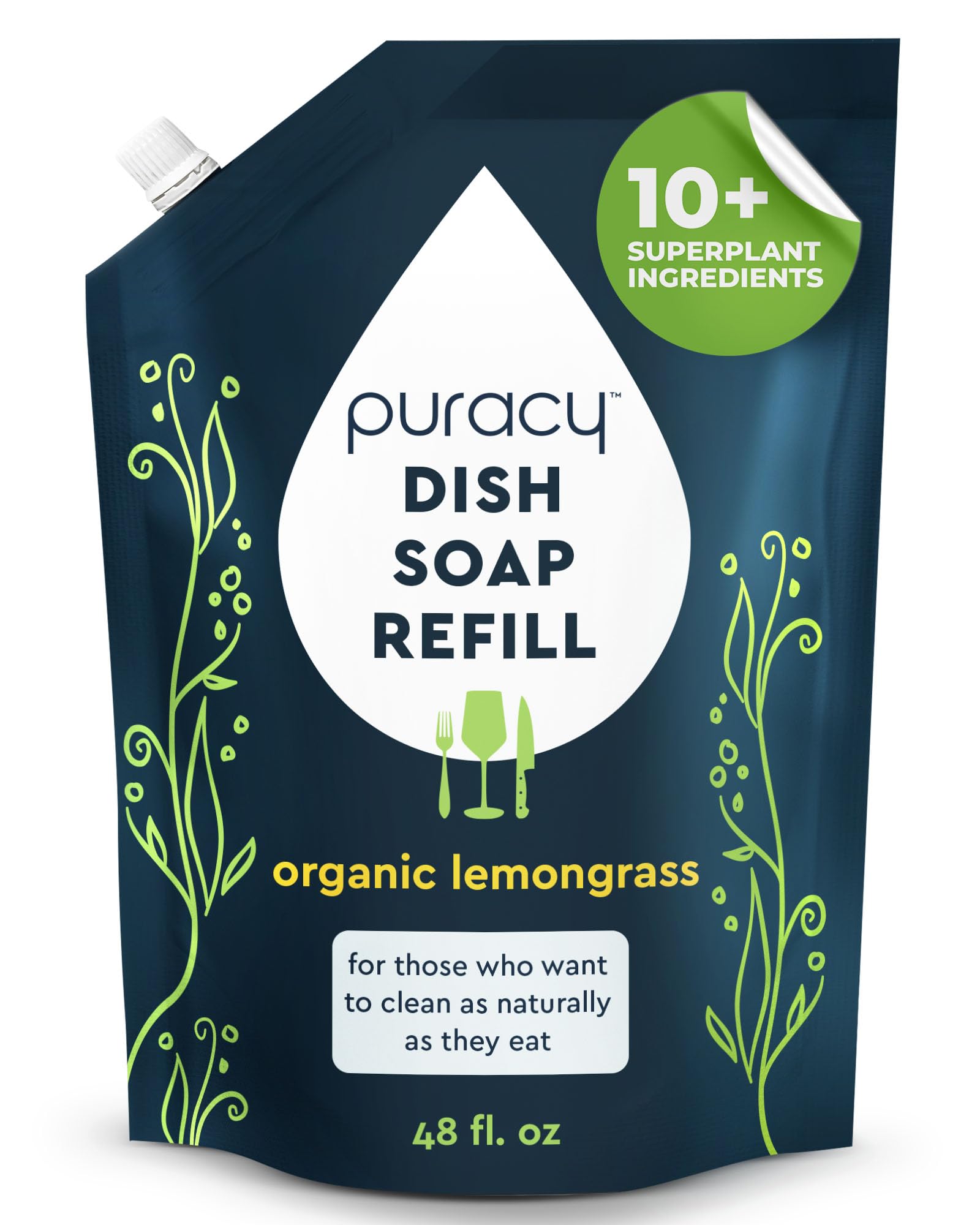 Puracy Natural Dish Soap Refill - Skin-Softening Plant-Based Liquid Dishwashing Detergent Soap, Clean-Rinsing Water-Sheeting Formula (Organic Lemongrass, 48 fl oz)