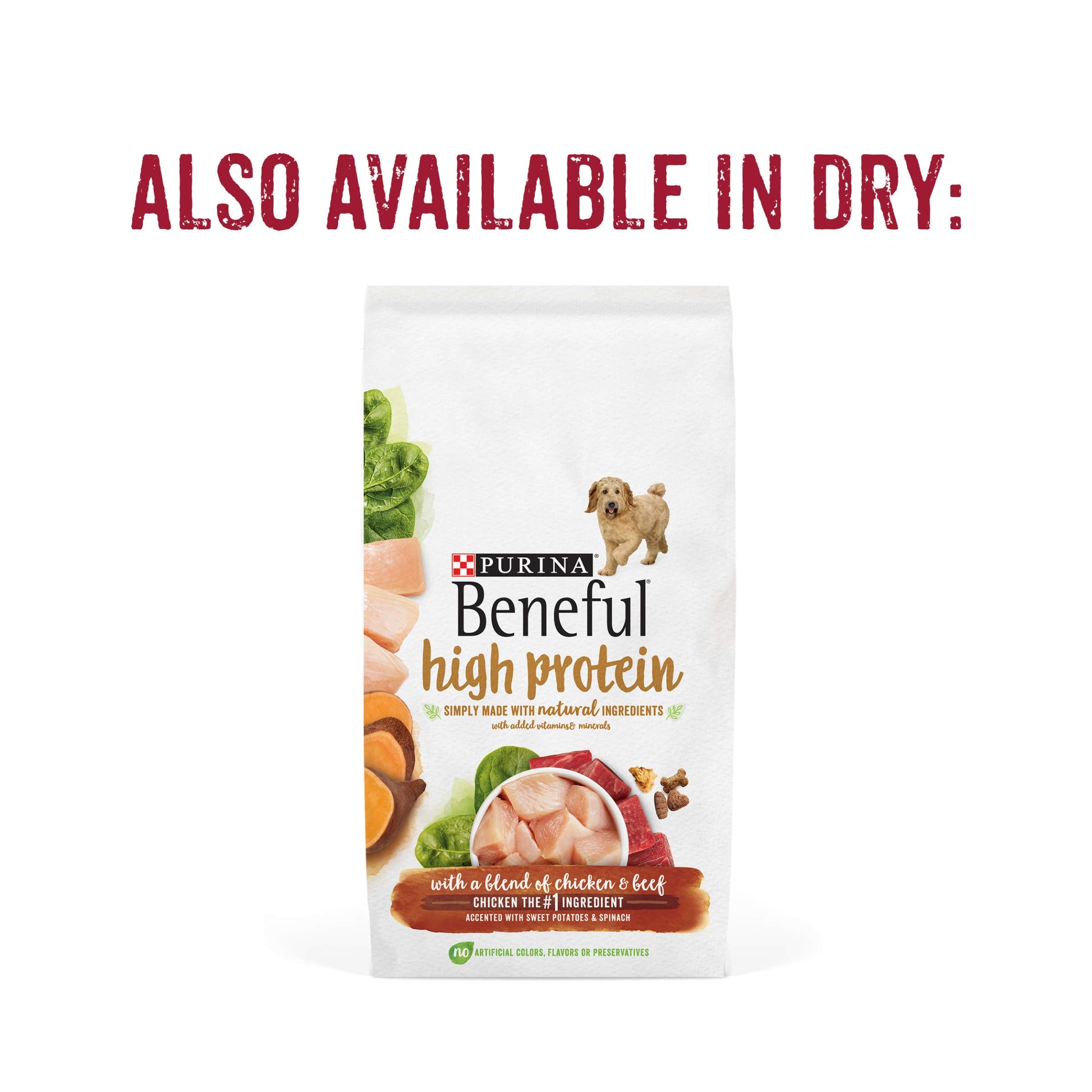 Details: Make mealtime an adventure for your dog with the four recipes in the Purina Beneful Chicken, Beef and Lamb Recipes adult dog food variety pack. Each entree features real beef, lamb or chicken, providing high-quality protein to help support his strong, lean muscles. Real vegetables and wholesome grains add goodness you can see. The small chunks of finely chopped pieces in these recipes are ideal for little dogs. This quartet of 100 percent complete and balanced recipes for adult dogs is made without artificial colors, flavors or preservatives. Every flavorful variety in this 30-count pack includes 23 essential vitamins and minerals to help support your dog's whole-body health. We craft these recipes in our Purina-owned facilities in the USA, so you can feel confident in their quality and safety. Serve these wet dog foods as a standalone meal, or mix them with his favorite Beneful dry dog food for a combination of soft and crunchy textures that delights your best friend's palate.