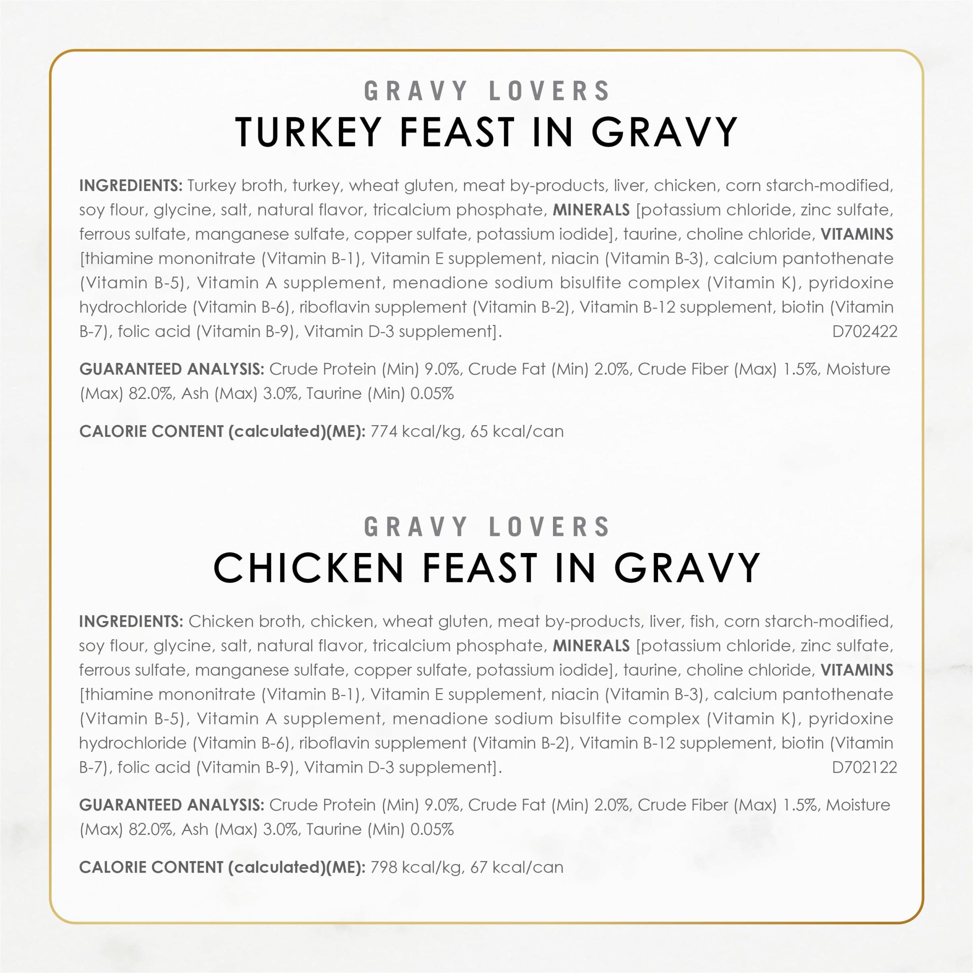 Details: Offer your discerning cat the gourmet tastes she loves with Purina Fancy Feast Gravy Lovers Poultry and Beef Feast Collection wet cat food. Chicken, turkey and beef give this collection the savory taste she craves, and the rich gravy in every serving of this canned cat food is sure to have her licking her dish clean. Small, delicate bites slow-cooked to perfection deliver a tempting texture, and the assortment of flavors makes it easy to keep your cat's curiosity piqued at mealtime. With essential vitamins and nutrients to support her overall health and wellness, this gourmet wet cat food lets you feel good about the foods you put into her dish. Offer up a different delectable flavor at each feeding, and show your feline friend just how important she is to you and your family with this collection of mouthwatering Fancy Feast Gravy Lovers cat food cans. She shouldn't have to wait for dinner, and you shouldn't have to, either. Get Purina Fancy Feast wet cat food fast from Amazon.com.