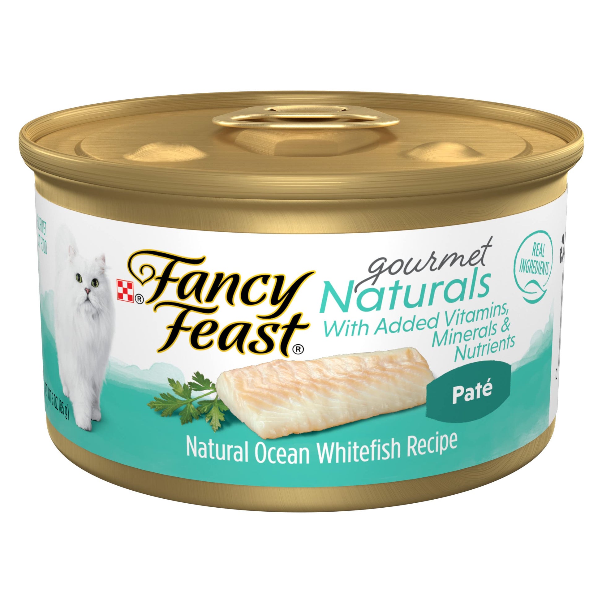 Details: Deliver deep-sea deliciousness to your cat's dish in a recipe you feel good about with Purina Fancy Feast Gourmet Naturals Ocean Whitefish Pate Recipe With Added Vitamins, Minerals and Nutrients adult wet cat food. We craft this cat food without corn, soy, fillers or fish by-products to meet your ingredient preferences. Our ocean whitefish entree makes it easy to land your discerning cat a meal that delivers an exceptional gourmet taste Fancy Feast is known for in a natural cat food recipe with added vitamins, minerals and nutrients to support her health. This pate contains real, high-quality ingredients and no artificial flavors, colors or preservatives. Each can provides your adult cat with 100 percent complete and balanced nutrition and is carefully formulated in U.S. facilities. Open the pull-tab can, and watch the tempting aromas found in this Fancy Feast wet cat food lure her to her dish where the flavor-filled, gourmet catch of the day waits.