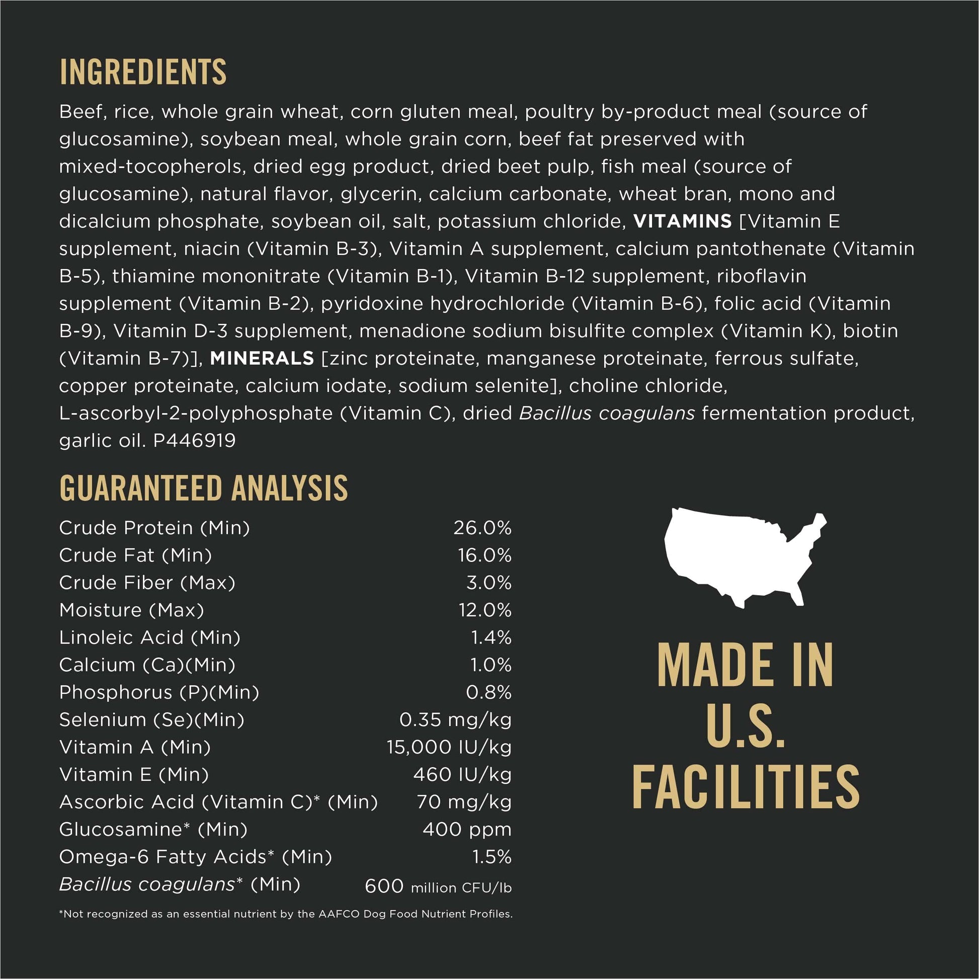 Details: Give your dog a perfect balance of outstanding nutrition and exceptional taste with Purina Pro Plan Brand Dog Food Shredded Blend Beef and Rice Formula adult dry dog food. Fortified with guaranteed live probiotics to support digestive and immune health, this high-protein dog food features real beef as the first ingredient and rice, so there's no compromise on nutrition or flavor. This tasty Purina Pro Plan dog food formula combines hard dog kibble with tender shredded bites for a unique texture dogs love along with Vitamin A and linoleic acid, an omega-6 fatty acid, to promote healthy skin and coat. Providing 100 percent complete and balanced nutrition for adult dogs, this adult dog food offers an optimal protein-to-fat ratio to help your dog maintain an ideal body condition. Feed him Purina Pro Plan Brand Dog Food Shredded Blend Beef and Rice Formula adult dry dog food to give him a great-tasting probiotic dog food that's manufactured in our Purina-owned, U.S. facilities.