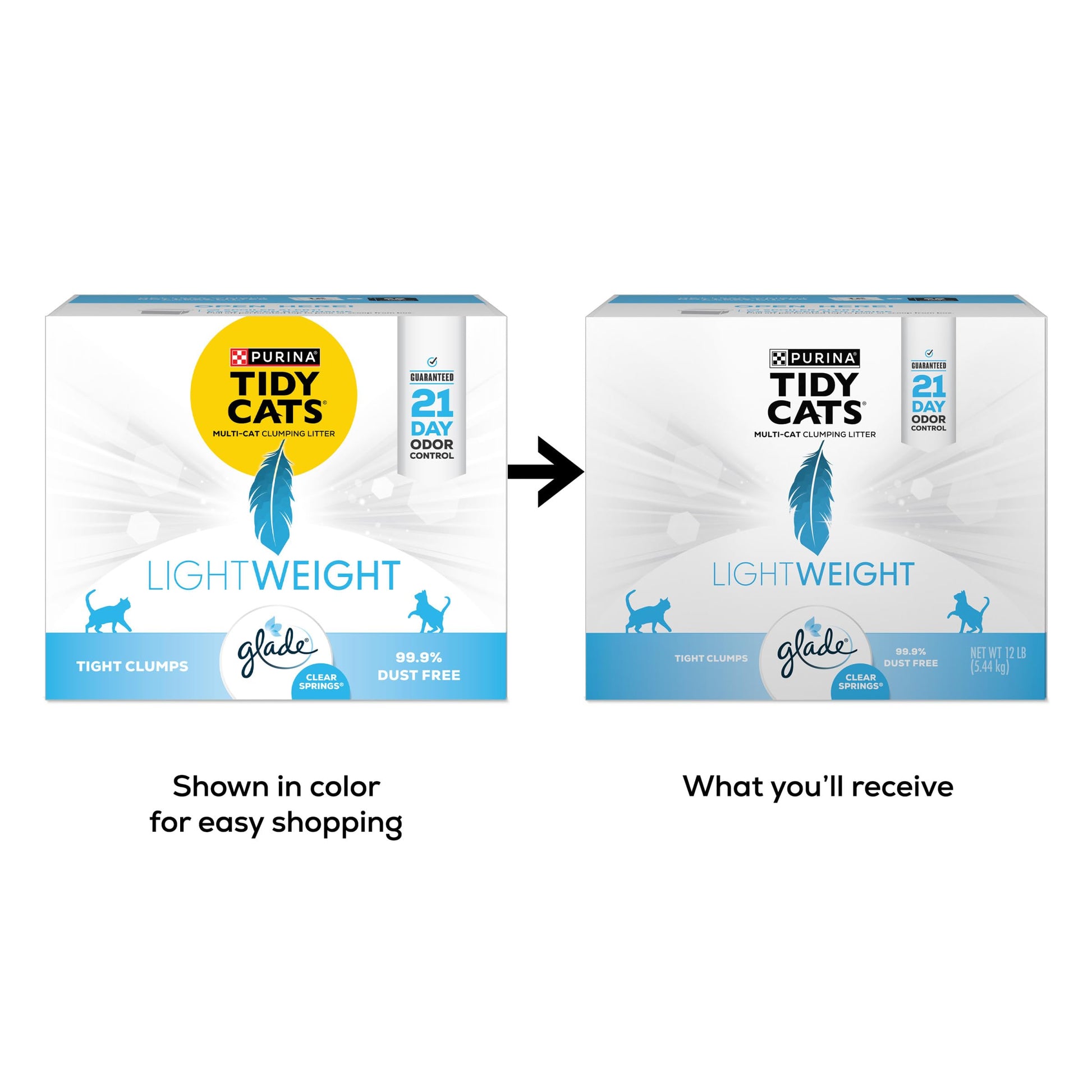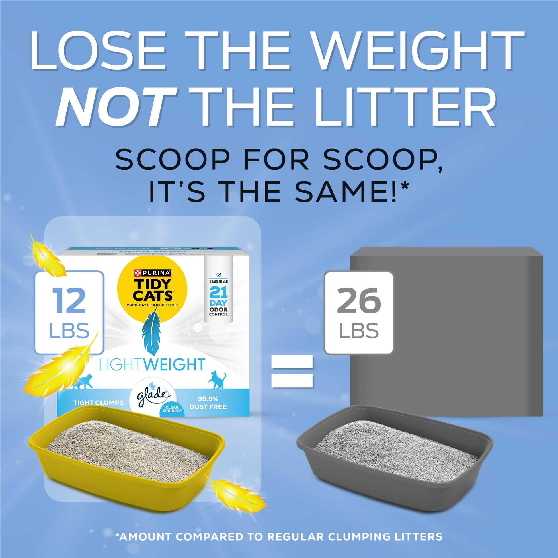 Details: Combine powerful odor control and a pleasant scent without the pain of litterback with Purina Tidy Cats LightWeight Litter With Glade Clear Springs Multi-Cat Clumping, scoopable cat litter. This multi cat litter prevents ammonia odor for 21 days (when used as directed) offering great odor protection with a fresh scent at a fraction of the weight. Tidy Cats litter is easy to carry, weighing half as much as the leading clumping cat litter without sacrificing litter amount. The low dust cat litter is easy to use and is 99.9 percent dust free and forms strong, tight clumps for quick and easy scooping. This multi cat litter offers an option for large cat families with a powerfully absorbent scented cat litter that can go into every cat litter box to make each box a welcoming place for your cats. Tidy Cats LightWeight With Glade Clear Springs clumping cat litter offers the powerful odor control you want with less weight.