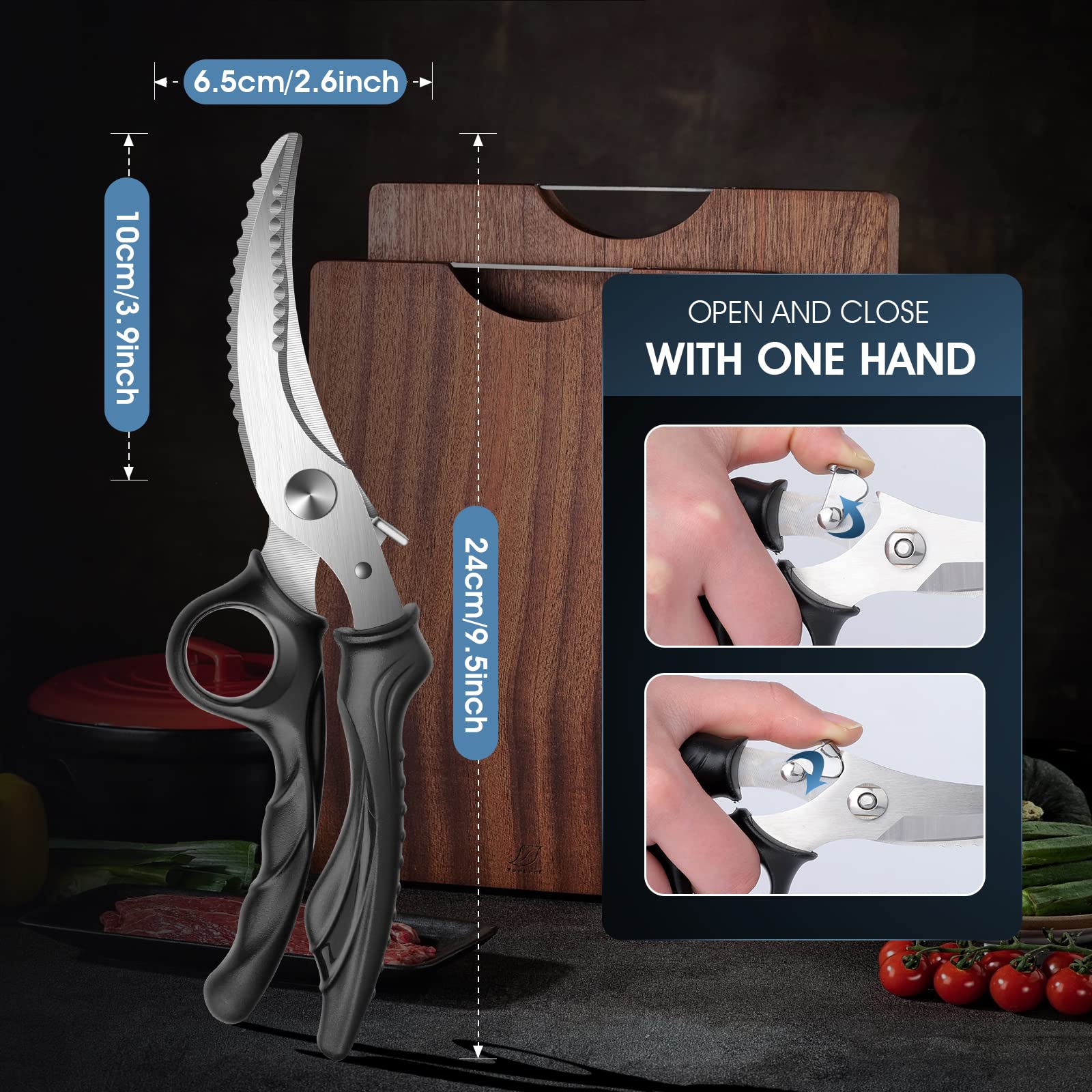 • Cut Like a Pro- These heavy duty poultry shears are your secret weapon for effortless cutting. With their versatile functionality blades, you can easily handle vegetables, fruits, and meats, even a whole turkey is no problem. You can also use it to descale fish.