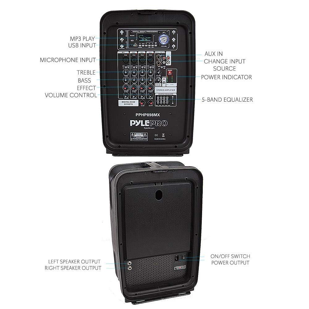 Details: Pyle Model : PPHP898MX Stage & Studio DJ Speaker & Mixer Bundle Bluetooth PA Speaker & Amplifier Mixer System Kit - Dual Loudspeakers, 8-Ch. Audio Mixer, MP3/USB Reader, +48V Mic Phantom Power System Features : All-in-One DJ Audio Loud-Speaker Kit 8-Channel Powered Amplifier Audio Mixer Dual Molded Cabinet PA Speakers Sound System : (2) x 8'' Subwoofers, (2) x 1’’ Piezo Horn Tweeters Rugged, Durable & Reliable Sound Bluetooth Wireless Music Streaming Ability Compression Drivers with Titanium Diaphragms 2-Way Full Range Audio Projection Built-in Digital Audio Amplifier Independent Channel Audio Configuration Settings Audio Mixer Console Button Control Center 5-Band Graphic EQ Control +48V Phantom Power Switch USB Flash Drive Memory Reader ID3 Tag Song Readout Info : LCD Displays Song Title/Song Artist Connect & Stream Audio from External Devices XLR (3-Pin) Connectors 1/4’’ (6.35mm) Input RCA (L/R) Stereo Line Input/output Jacks Heavy Duty Engineered ABS Housing Convenient System Design Assembles & Disassembles for Quick Setup Perfect for On-Stage Performances, Crowd Control, Public Gathering Events Bluetooth Wireless Streaming : Instantly Stream Music from Your Bluetooth Devices Works with All Your Favorite Bluetooth Devices (iPhone, Android, Smartphone, iPad, Tablet, PC, etc.) Bluetooth Version : 4.0 Bluetooth Network Name : ‘BLUE’ Wireless Range : Up to 30'+ ft. What's in the Box : (2) 8’’ PA Speakers Audio Mixer Console Speaker Connection Cables (1/4’’) Power Cable Technical Specs : Power Output : 600 Watt MAX Speaker Style : Molded Cabinet Magnet : 20 Oz Voice Coils : 1.0’’ -inch Amplifier Class : D Impedance : 4 Ohm (x2) T.H.D. : Sensitivity : 98dB (+/-2dB) Mic Input Level : Line Input/output Level : >250mV Frequency Response : 40-18kHz Digital Audio File Compatibility : MP3, WMA Maximum SD/USB Flash Memory Support : 32GB Remote Battery : Requires (1) x ‘CR20-25’ Button Cell, Included Power : 110/220V Unit Dimensions (L x W x H) : 27.4’’ x 12.8’’ x 23.8’’ -inches The Pyle Bluetooth PA Speaker & Amplifier Mixer System Kit - Dual Loudspeakers, 8-Ch. Audio Mixer, MP3/USB Reader, +48V Mic Phantom Power - All-in-One DJ Audio Loud-Speaker Kit - 8-Channel Powered Amplifier Audio Mixer - Dual Molded Cabinet PA Speakers - Sound System : (2) x 8'' Subwoofers, (2) x 1’’ Piezo Horn Tweeters - Rugged, Durable & Reliable Sound - Bluetooth Wireless Music Streaming Ability - Compression Drivers with Titanium Diaphragms - 2-Way Full Range Audio Projection - Built-in Digital Audio Amplifier - Independent Channel Audio Configuration Settings - Audio Mixer Console Button Control Center - 5-Band Graphic EQ Control - +48V Phantom Power Switch - USB Flash Drive Memory Reader - ID3 Tag Song Readout Info : LCD Displays Song Title/Song Artist.