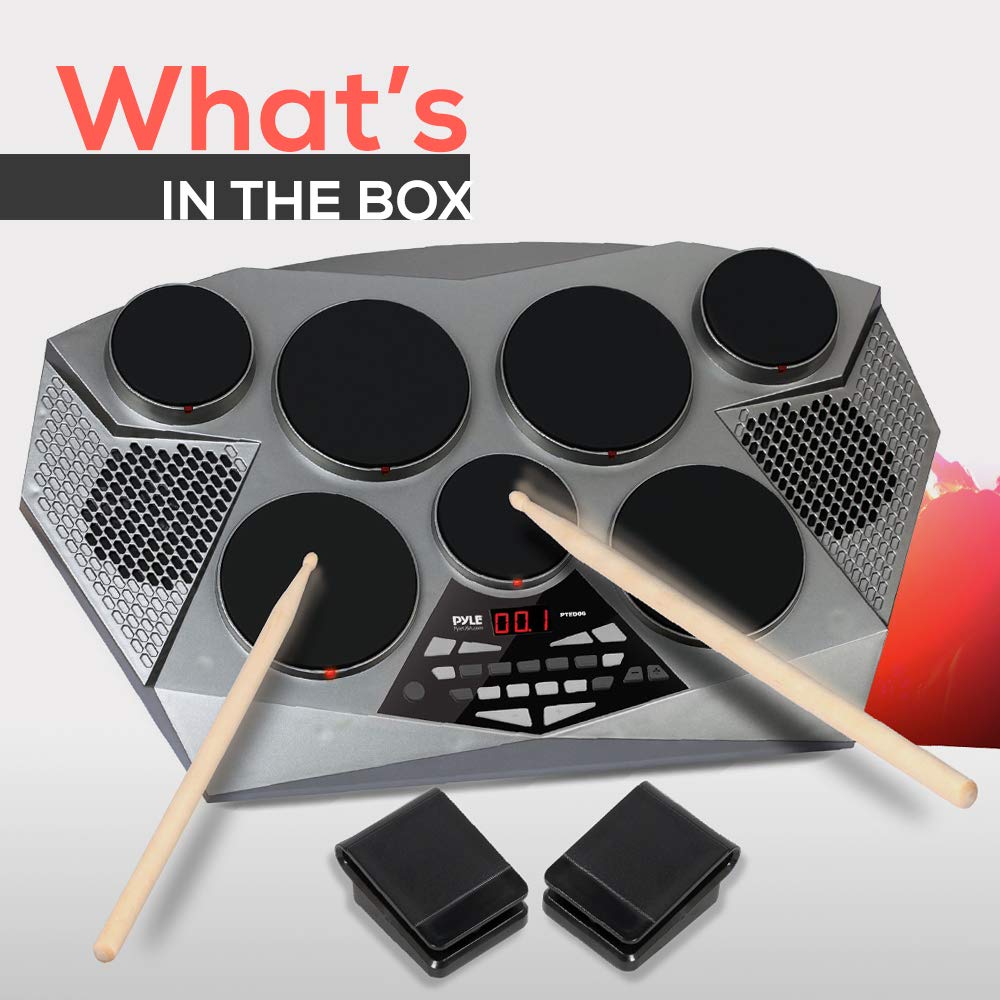 Pyle Pro Electronic Drum kit - Portable Electric Tabletop Drum Set Machine with Digital Panel, 7 Drum Pad, Hi-Hat / Kick Bass Pedal Controller USB AUX -Tom Toms, Hi-Hat, Snare Drums, Cymbals - PTED06