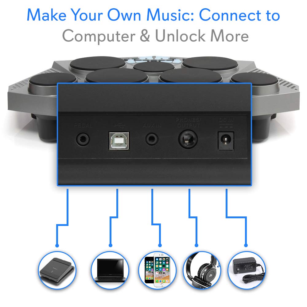 • CONNECT TO MAC AND PC: connect the table drum to your computer using a USB cable to act as a MIDI Connection for your favorite desktop software. it also has an AUX in jack for connecting other devices and a phone out jack for amplifiers of headphone