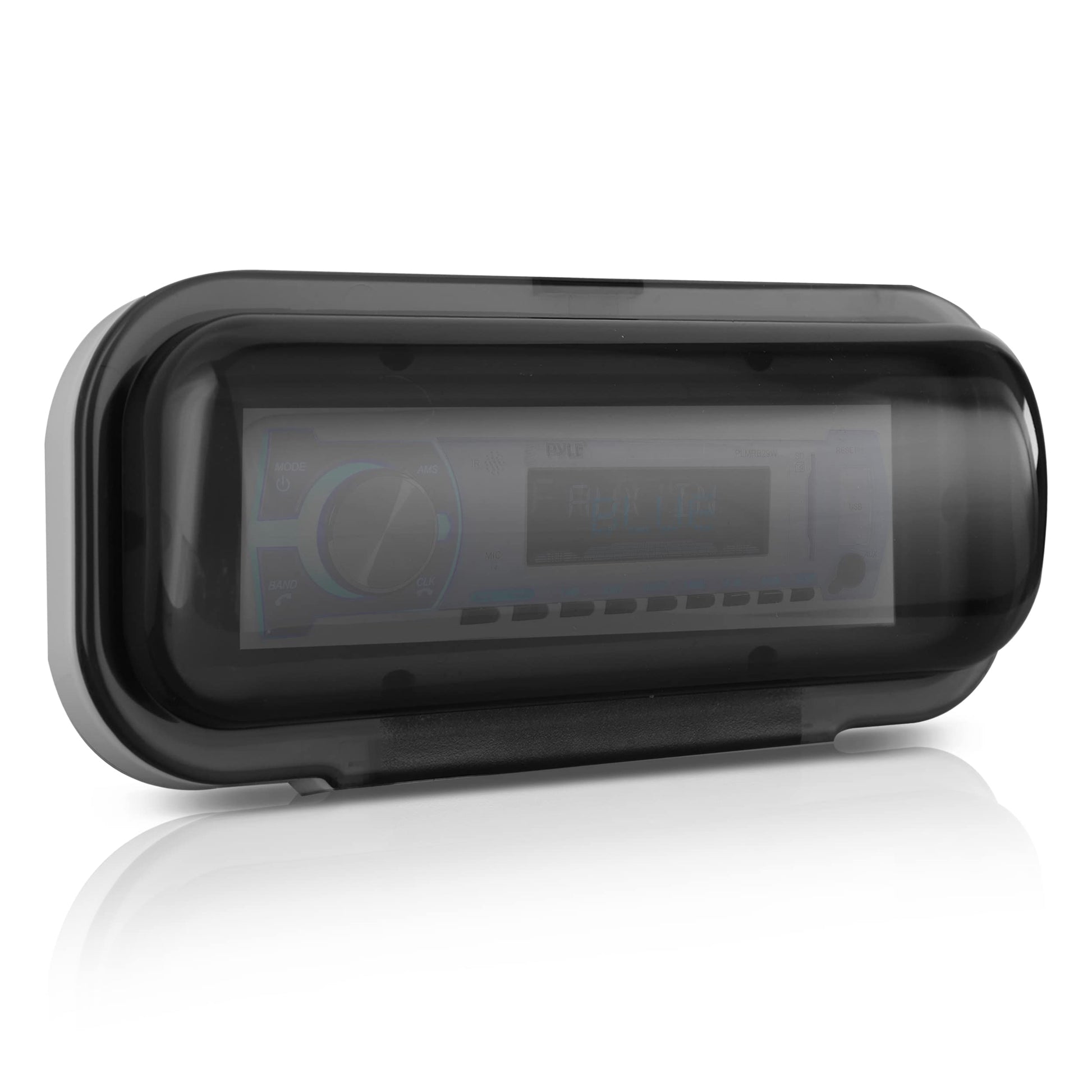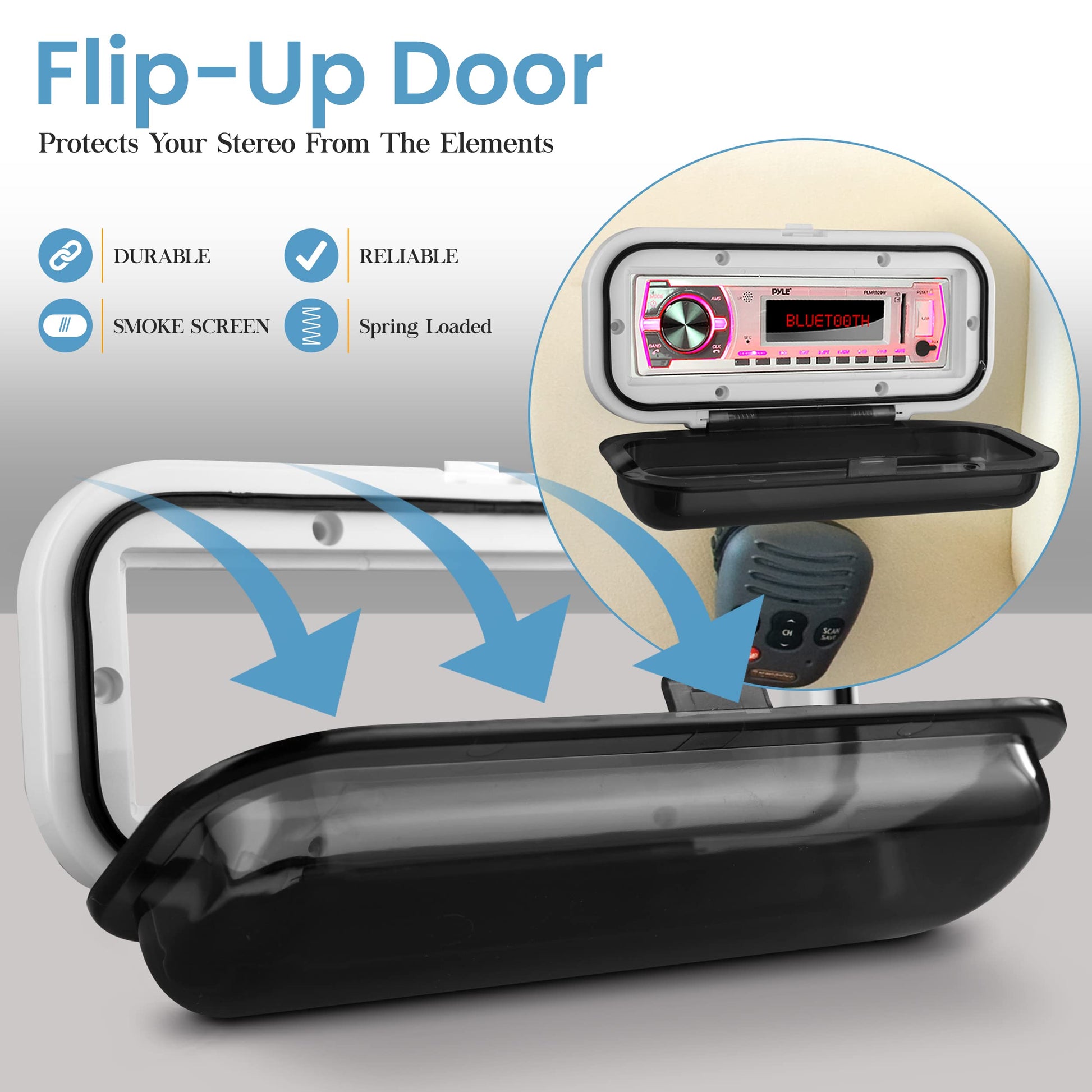 Pyle Water Resistant Marine Stereo Cover - Smoke Colored Heavy Duty Boat Radio Protector Shield with Flip-up Door & Spring Loaded Release - Mounting Gasket Included - PLMRCW1