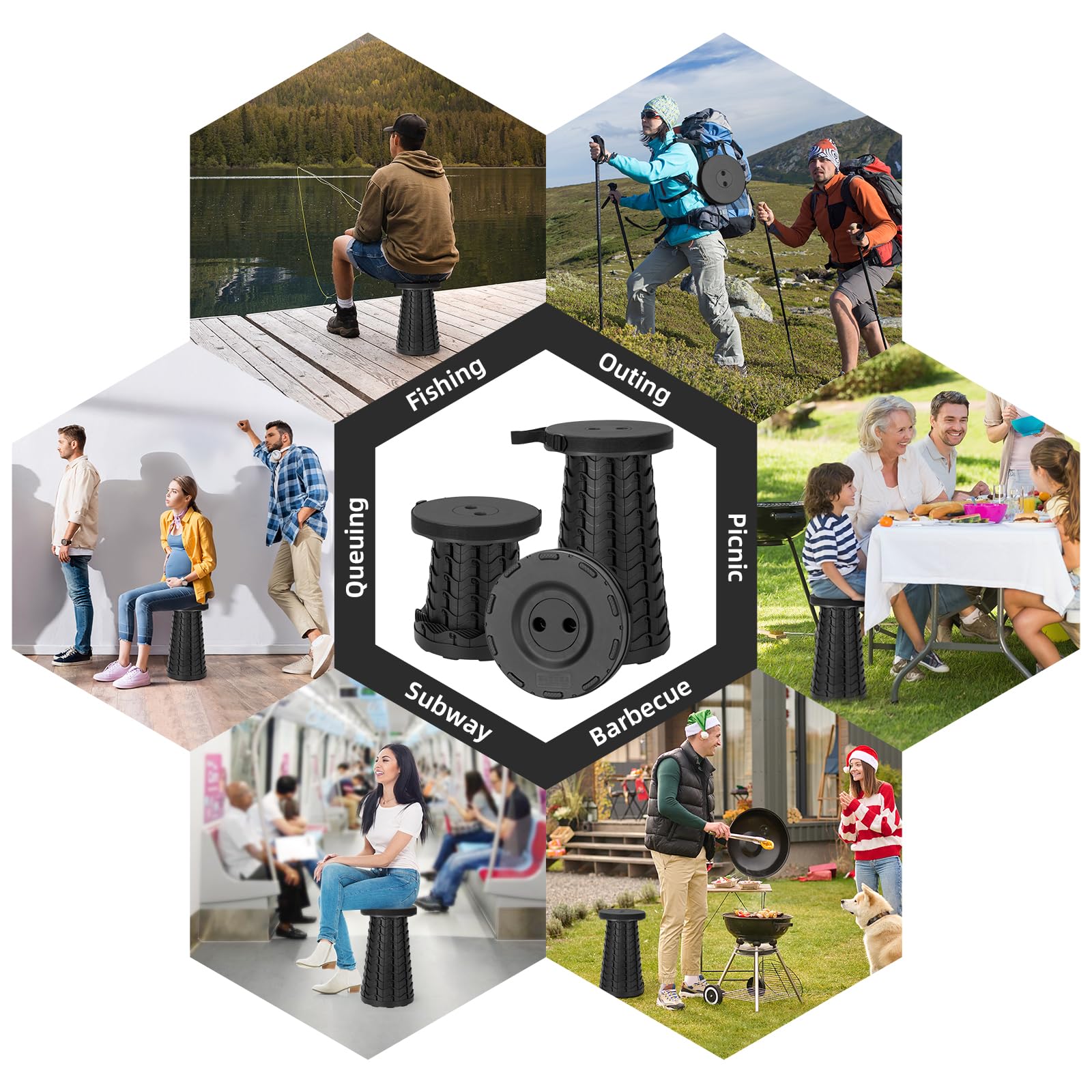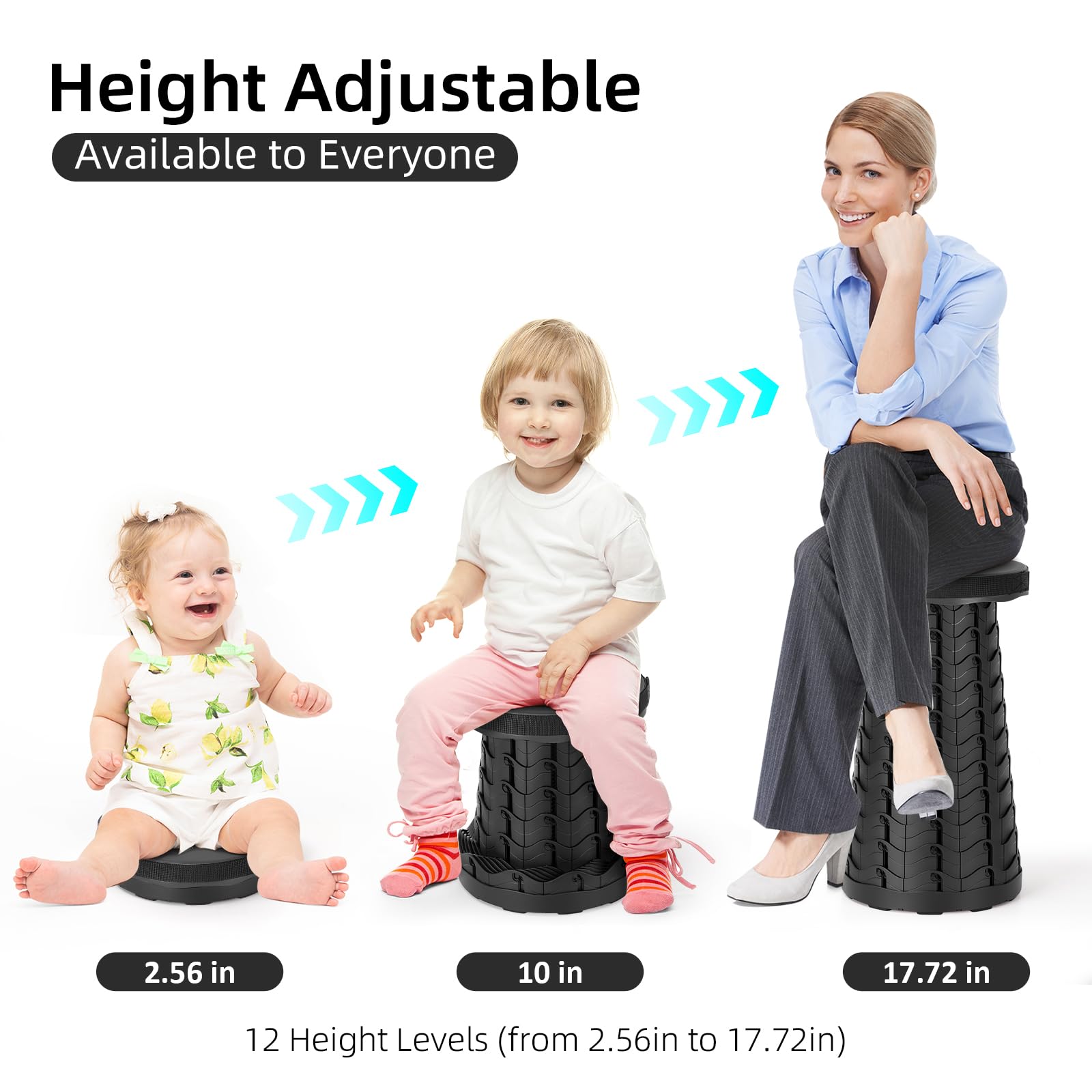 • 【12 Height Levels】The height change of our portable chair from fully closed to fully open is 2.56 inches to 17.72 inches. We have designed twelve heights, you are free to choose the height that makes you comfortable and use it. So our telescopic stool can be used by you and all your family.