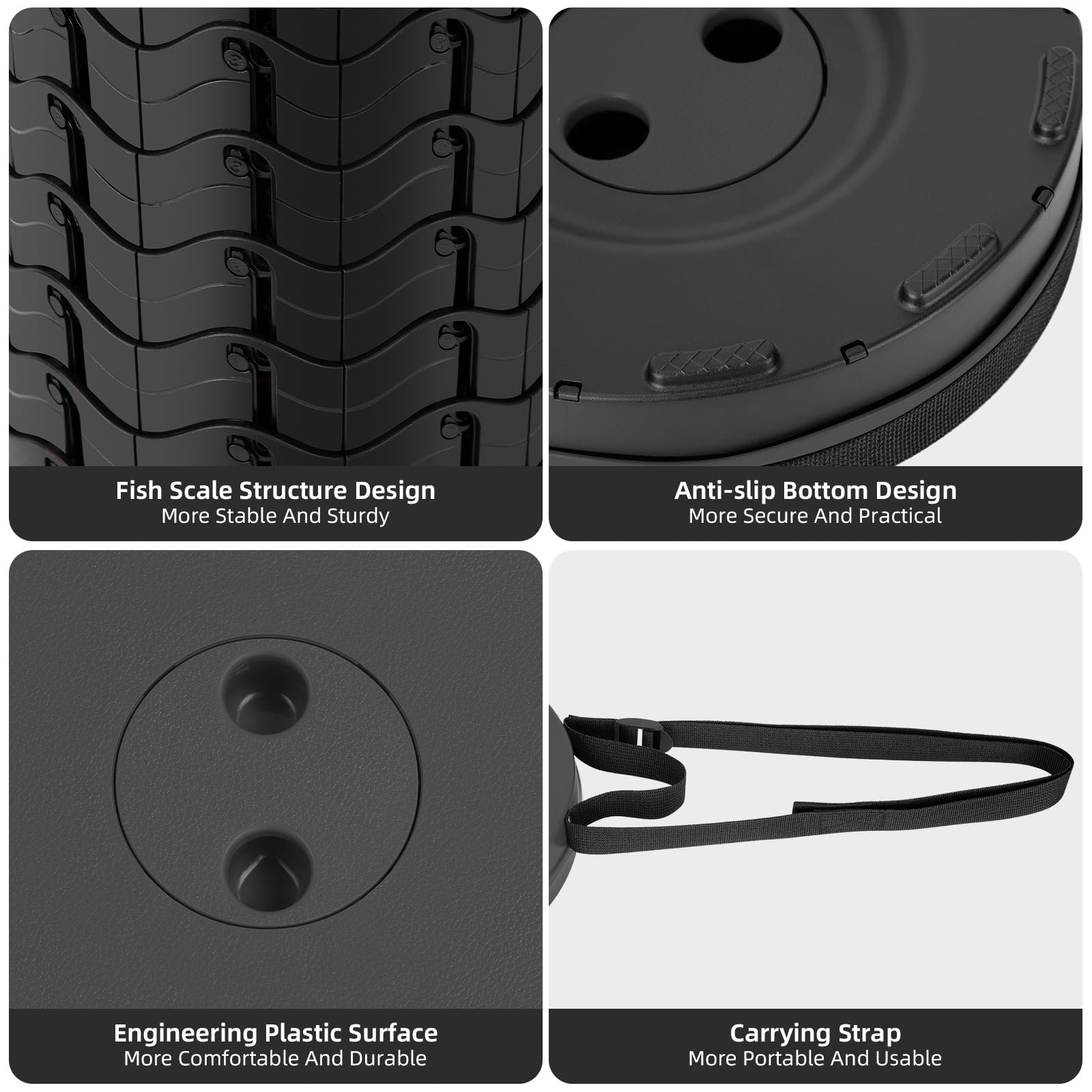 • 【Fish Scale Structure】The collapsible stool is made of high-density thickened PP material. And we use fish scale structure and high-precision buckle design to increase the strength, rigidity and stability of the folding chair. So our collapsible stool will be more sturdy and durable, with a load capacity of 400 pounds.