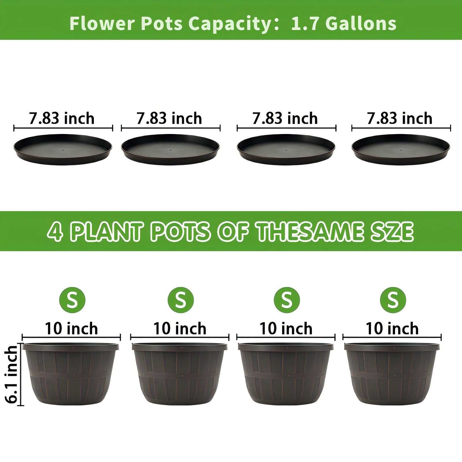 • 【Perfect Size & sturdy Material】Top diameter: 10 inch, bottom diameter: 6.7 inch, height: 6.1 inch, capacity: 1.7 gallon. Plastic plant pots are made of recyclable polypropylene resin which is lightweight but sturdy, not easy crack. These indoor outdoor planters are weather resistant. 10 inch flower pot is perfect for planting medium to large sized plants.