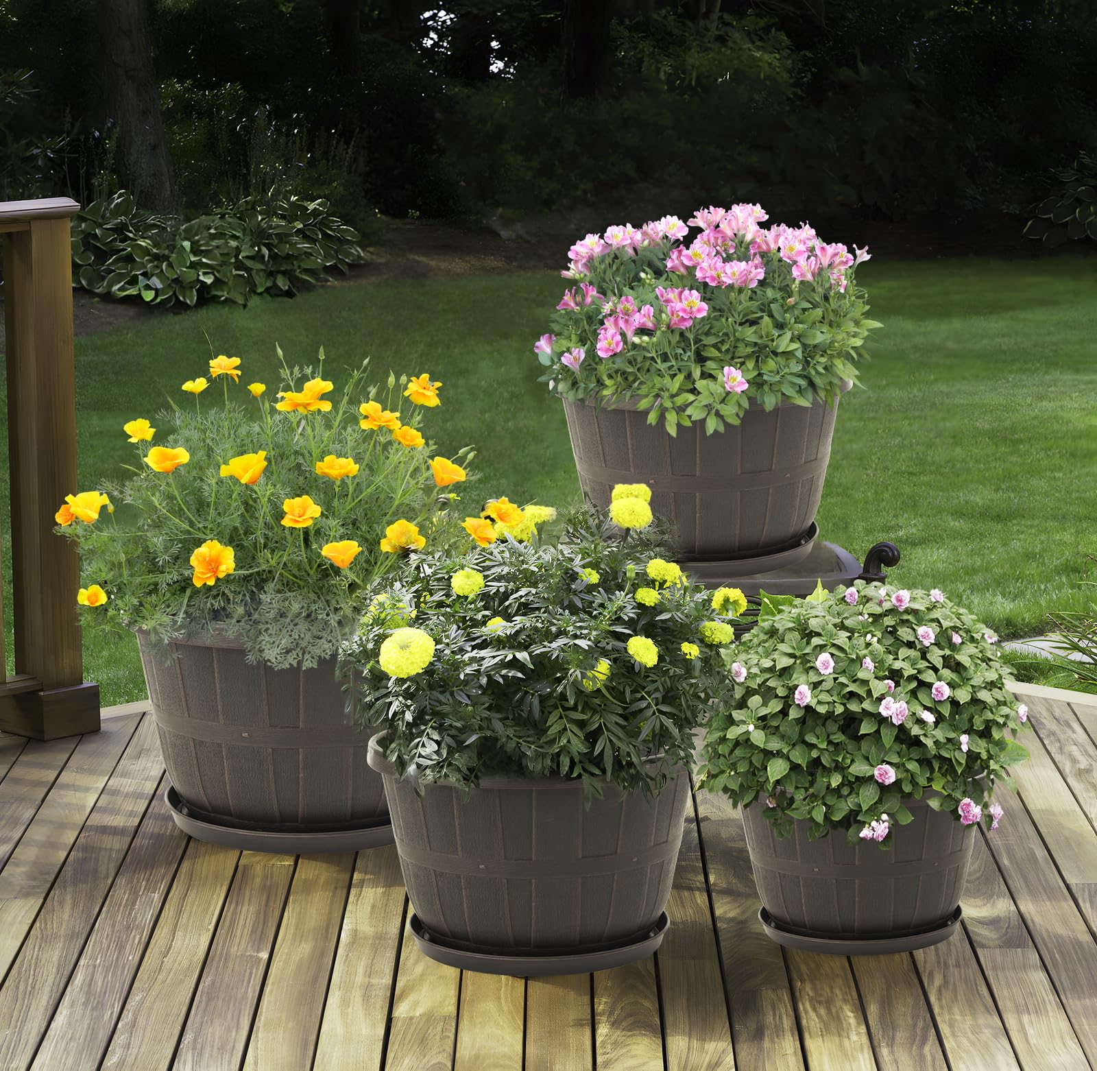 Quarut 10 inch Plastic Flower Pots for Outdoor Plants,4 Pack Large Outdoor Planter Pot with Drainage Holes & Saucers,Imitation Wine Barrel Design,for Indoor Outdoor Garden Plants(Brown)