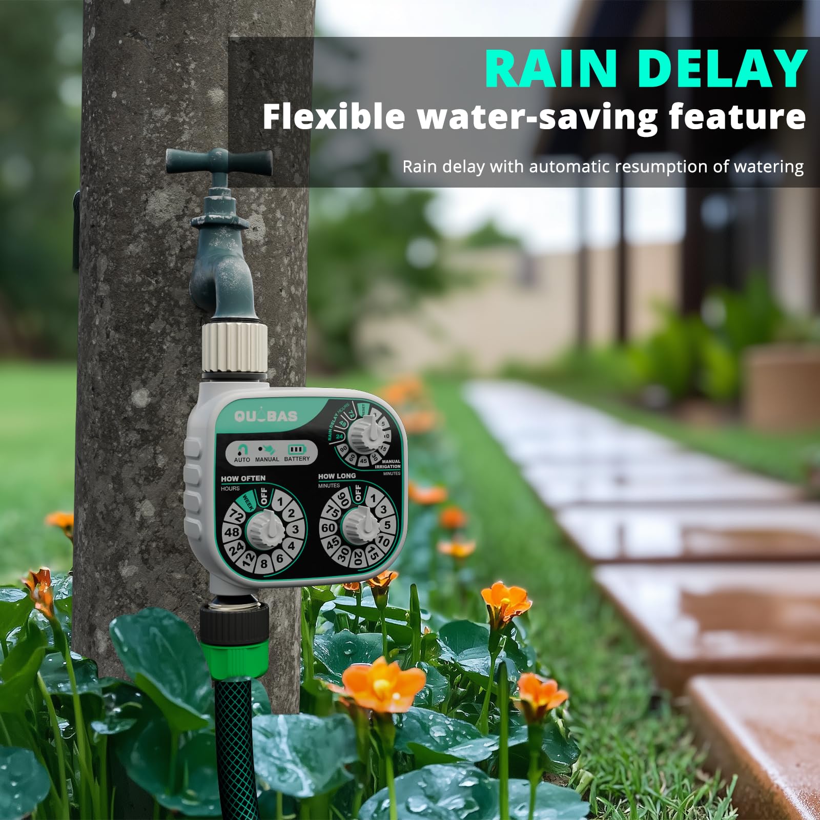 • Delay Your Watering: Turn “DELAY” dial to select delay watering duration and rain delay starts immediately, bypassing overwatering during rainy days.