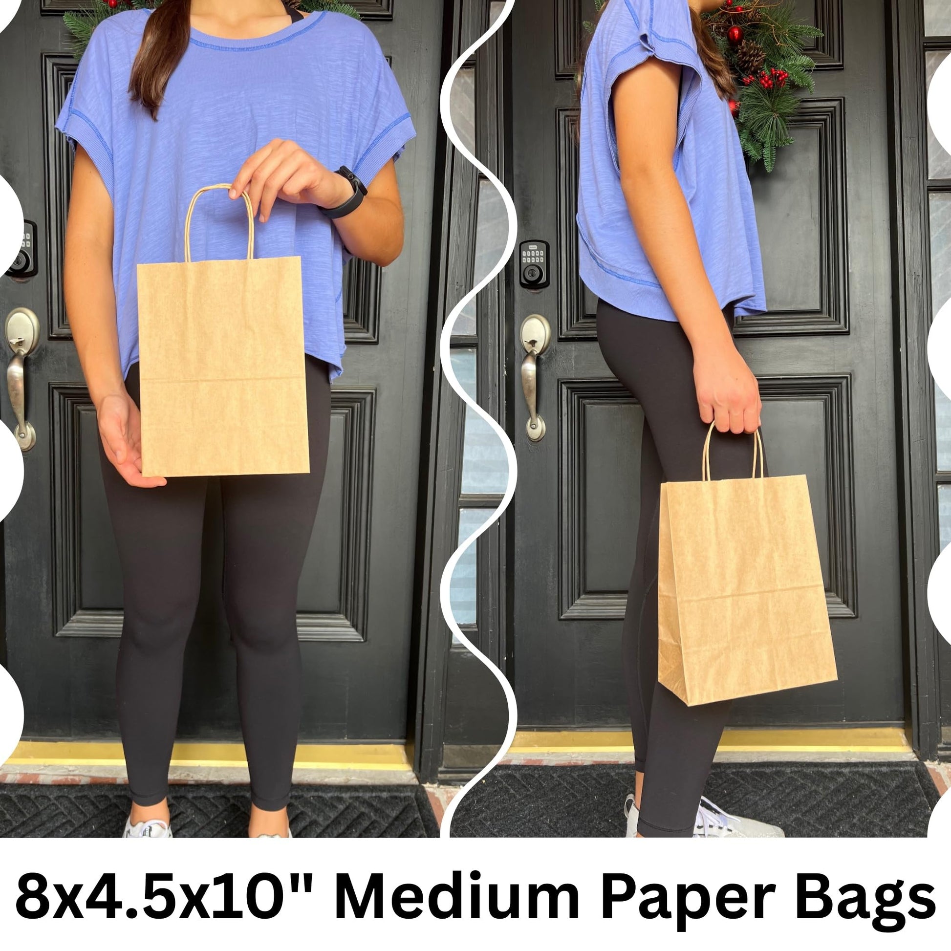 • ♻️ MEDIUM SIZE MULTIPURPOSE PAPER BAGS. 25 pcs 8”x4.5”x10” plain brown bags are great for holiday gift bags, retails bags, merchandise bags, shopping bags, party bags, goody bags, favor bag, christmas bags and wedding welcome bags. Our kraft bags' size tolerance is +/- 0.25 inches.