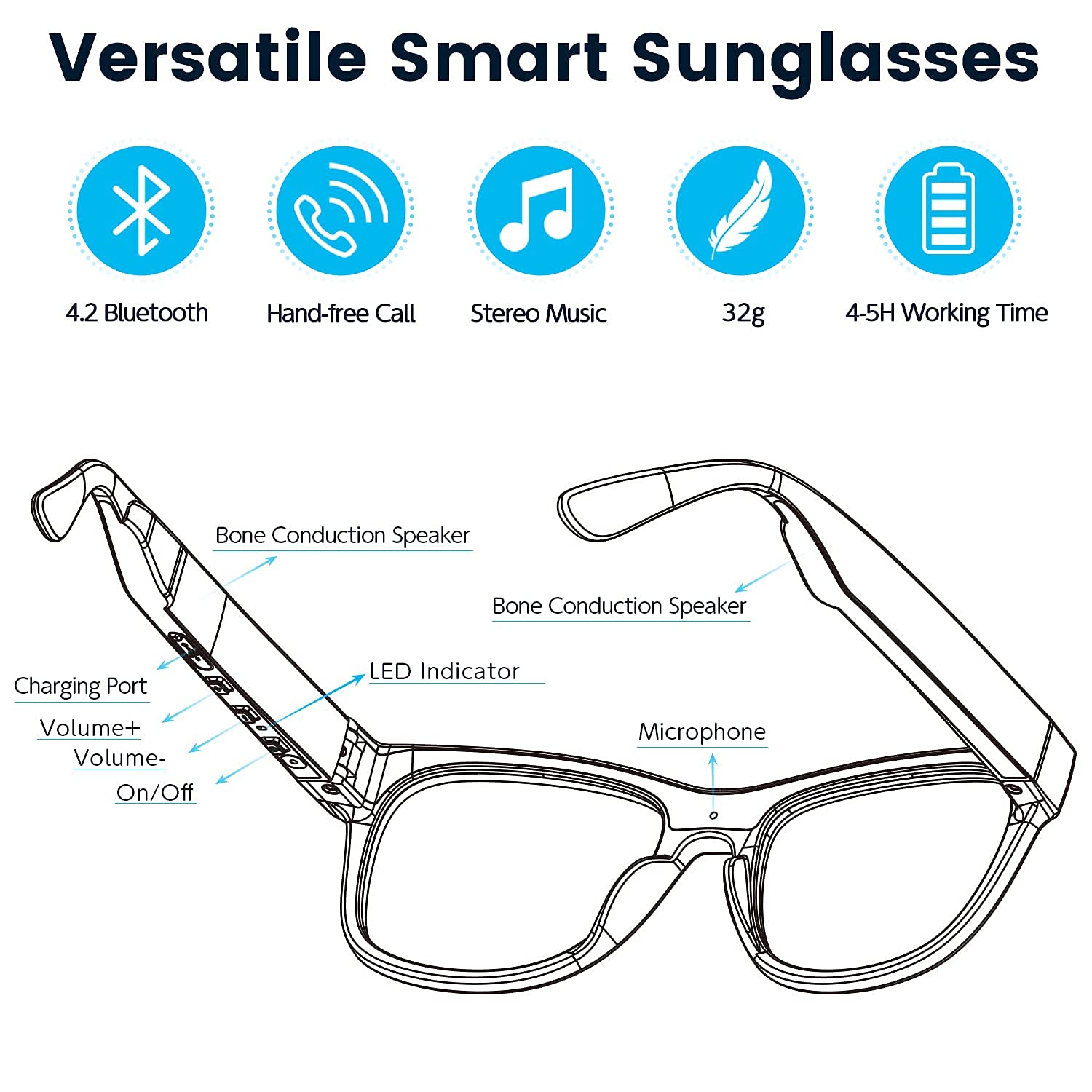 • Hands-Free Calling and Music: These wireless smart glasses offer convenience while driving or jogging. Easily control volume, calls, and music with frame buttons. For optimal experience, maintain Bluetooth device volume at 50%-60%; higher volume may cause sound leakage or echo during calls