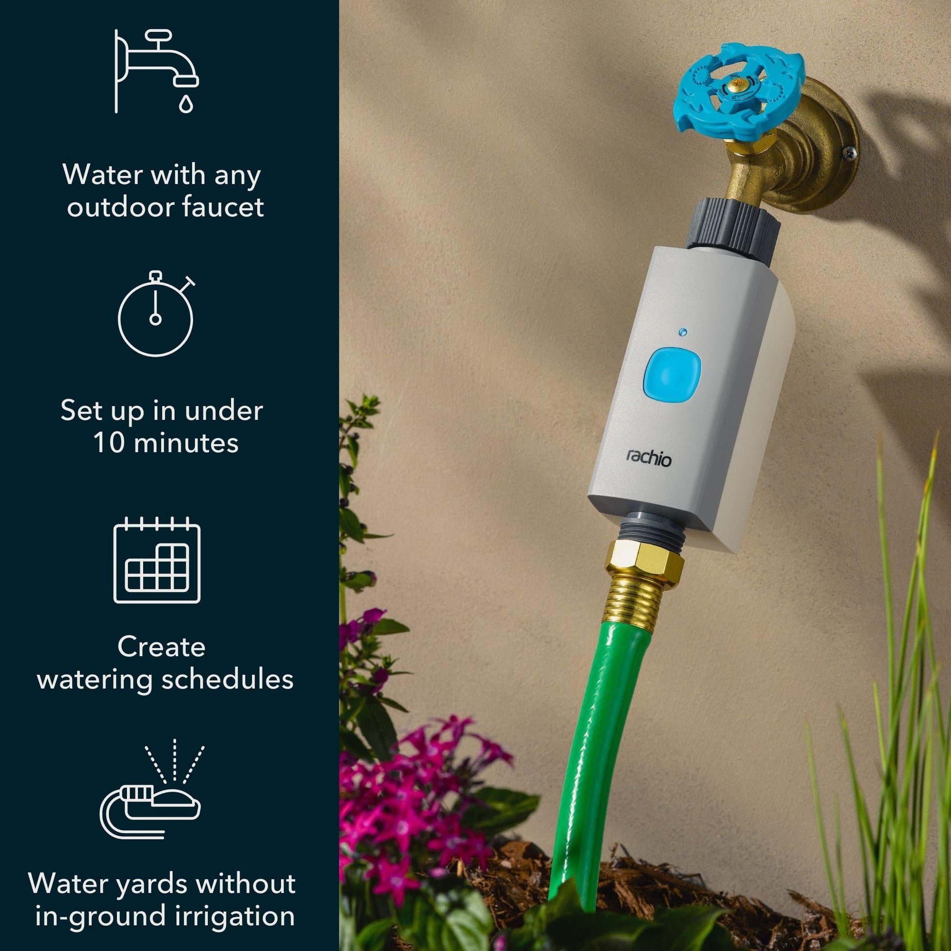 Details: Replace your hose timer. Ditch the dial. Say goodbye to unreliable plastic dial timers. The Rachio Smart Hose Timer puts hose watering in the palm of your hand with app-based control from anywhere. Set it up. Let it run. Easily create flexible schedules in the Rachio App, or press the button on the valve for instant watering. Built-in Rain Skips prevent waste when rain is on the way. Smart alerts & scalable control Flow monitoring alerts you to unexpected issues. Low-battery notifications help avoid surprises. Expand your system easily with up to eight valves per WiFi Hub. Better hose watering, made simple Install in minutes and manage it all from the trusted Rachio App. No more guesswork, no more wasted water—just smarter yard care. Works for most yards Comes with one valve and one WiFi Hub. Timer valves require a WiFi Hub and two AA batteries (not included) to operate. WiFi Hubs require 2.4 GHz WiFi. Pair up to eight valves on one WiFi Hub.