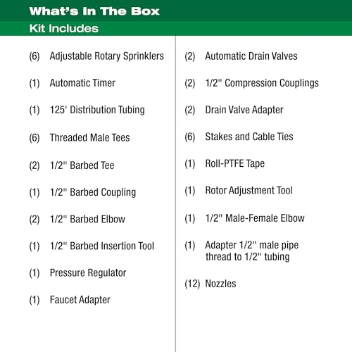 Rain Bird 32ETI Easy to Install In-Ground Automatic Sprinkler System Kit. This all-in-one kit includes everything needed to install a complete underground sprinkler system capable of watering an area from 1000 to 3,000 square feet; conveniently sourcing water from any outdoor hose faucet. An easy-to-install, affordable and effective automatic sprinkler system for homeowners. This system offers do-it-yourselfers a more efficient, automatic way to achieve a beautiful, green lawn without having to drag out a hose or remember to move a sprinkler around. Now you can spend the weekend enjoying your yard instead of worrying about watering it. Kit provides all the supplies necessary for a simple five-step installation. Kit consists of: 125' of 1/2' distribution tubing, fittings, (6) professional grade high-efficiency 32SA pop-up rotary sprinklers and a durable, professional-grade automatic 1ZEHTMR hose-end timer. The dependable 32SA Rotors feature Rain Bird's patented Rain Curtain™ nozzle technology which delivers a rotating curtain of large water droplets that fall exactly where you want them and resist windblown overspray. Water disperses evenly from nozzle to end of stream to reduce watering time and save money. 'Micro Ramps' on nozzle direct a portion of the spray close to the head eliminating dry brown spots common with other brands. Provides a true 4' pop-up height to clear taller grass. Simple adjustments for spray rotation and distance help keep water on your lawn and off the house, sidewalk and driveway. Water-lubricated, gear-driven design provides long-lasting dependability. A dual-action, positive-stop wiper seal protects the internals from debris while assuring positive pop-up and retraction. Adjusts easily from 40° to 360° part-circle arc, and reversing full-circle arc rotation using a flat head screwdriver. The robust 1ZEHTMR hose-end timer features a large display and simple programming allowing users to enter a desired watering schedule for any days of the week they choose up to two times a day. The sophisticated, yet simple timer is easily customizable to comply with local watering restrictions or other specific needs, such as watering sloped areas and avoiding runoff. 'Water Now' and 'Cancel Watering' settings provide optimal control without interrupting pre-programmed settings. “Cancel Watering” feature also operates as a 'Rain Delay' allowing selection of up to a 96-hour pause in watering before stored programming resumes. Timer working temperatures: keep from freezing to 110° F maximum. Operates on two AA batteries (not included). Rain Bird 'The Intelligent Use of Water'